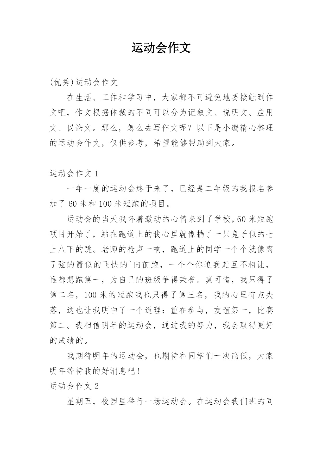 运动会作文(优秀)运动会作文在生活、工作和学习中,大家都不可避免地要接触到作文吧,作文根据体裁的不同可以分为记叙文、说明文、应用文、议论文。那么,怎么去写作文呢?以下是小编精心整理的运动会作文,仅供参考,希望能够帮助到大家。运动会作文1一年一度的运动会终于来了,已经是二年级的我报名参加了60米和100米短跑的项目。运动会的当天我怀着激动的心情来到了学校,60米短跑项目开始了,站在跑道上的我心里就像揣了一只兔子似的七上八下的跳。老师的枪声一响,跑道上的同学一个个就像离了弦的箭似的飞快的`向前跑,一个个你追我