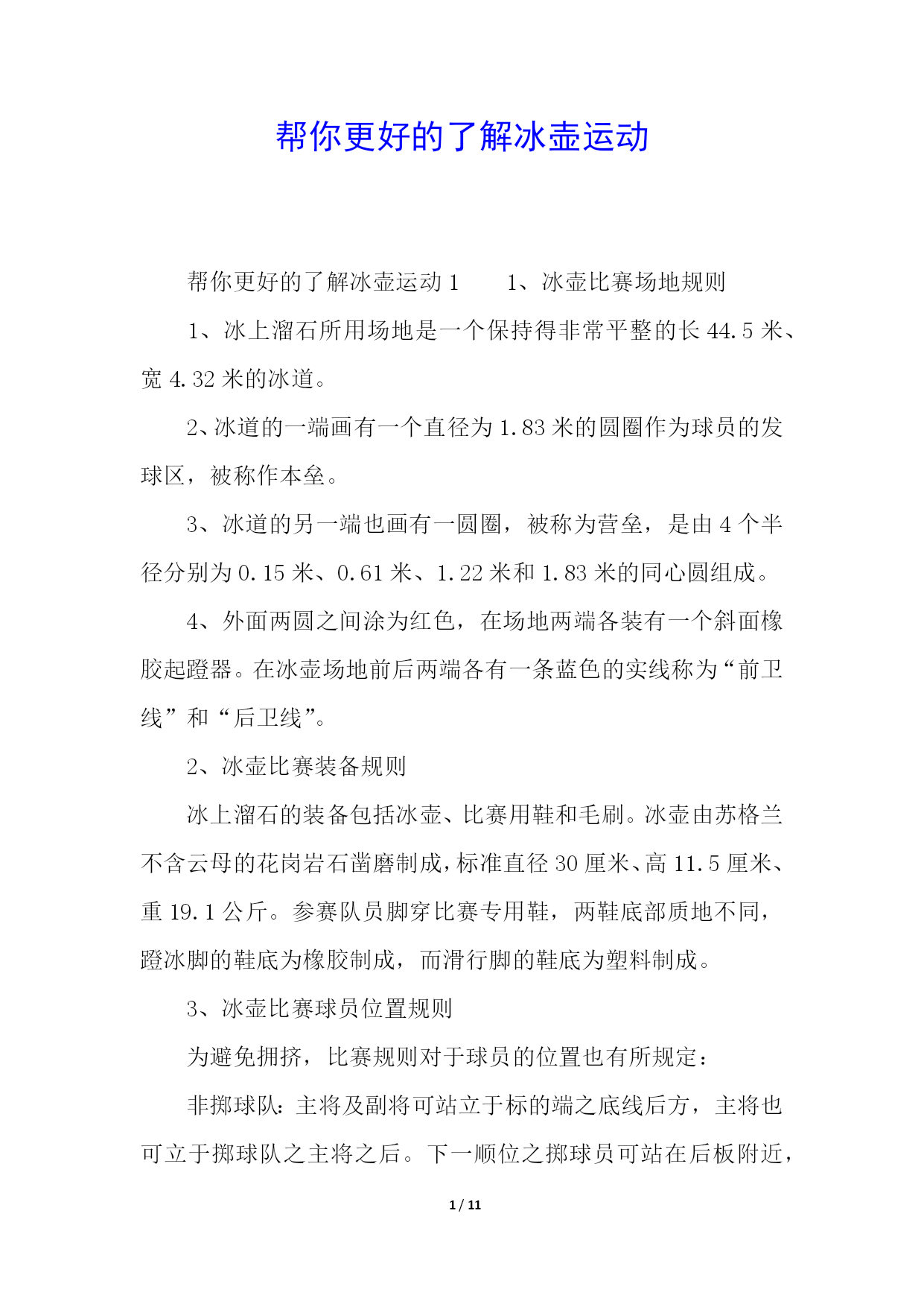 PAGE11/NUMPAGES11帮你更好的了解冰壶运动帮你更好的了解冰壶运动11、冰壶比赛场地规则1、冰上溜石所用场地是一个保持得非常平整的长44.5米、宽4.32米的冰道。2、冰道的一端画有一个直径为1.83米的圆圈作为球员的发球区,被称作本垒。3、冰道的另一端也画有一圆圈,被称为营垒,是由4个半径分别为0.15米、0.61米、1.22米和1.83米的同心圆组成。4、外面两圆之间涂为红色,在场地两端各装有一个斜面橡胶起蹬器。在冰壶场地前后两端各有一条蓝色的实线称为“前卫线”和“后卫线”。2