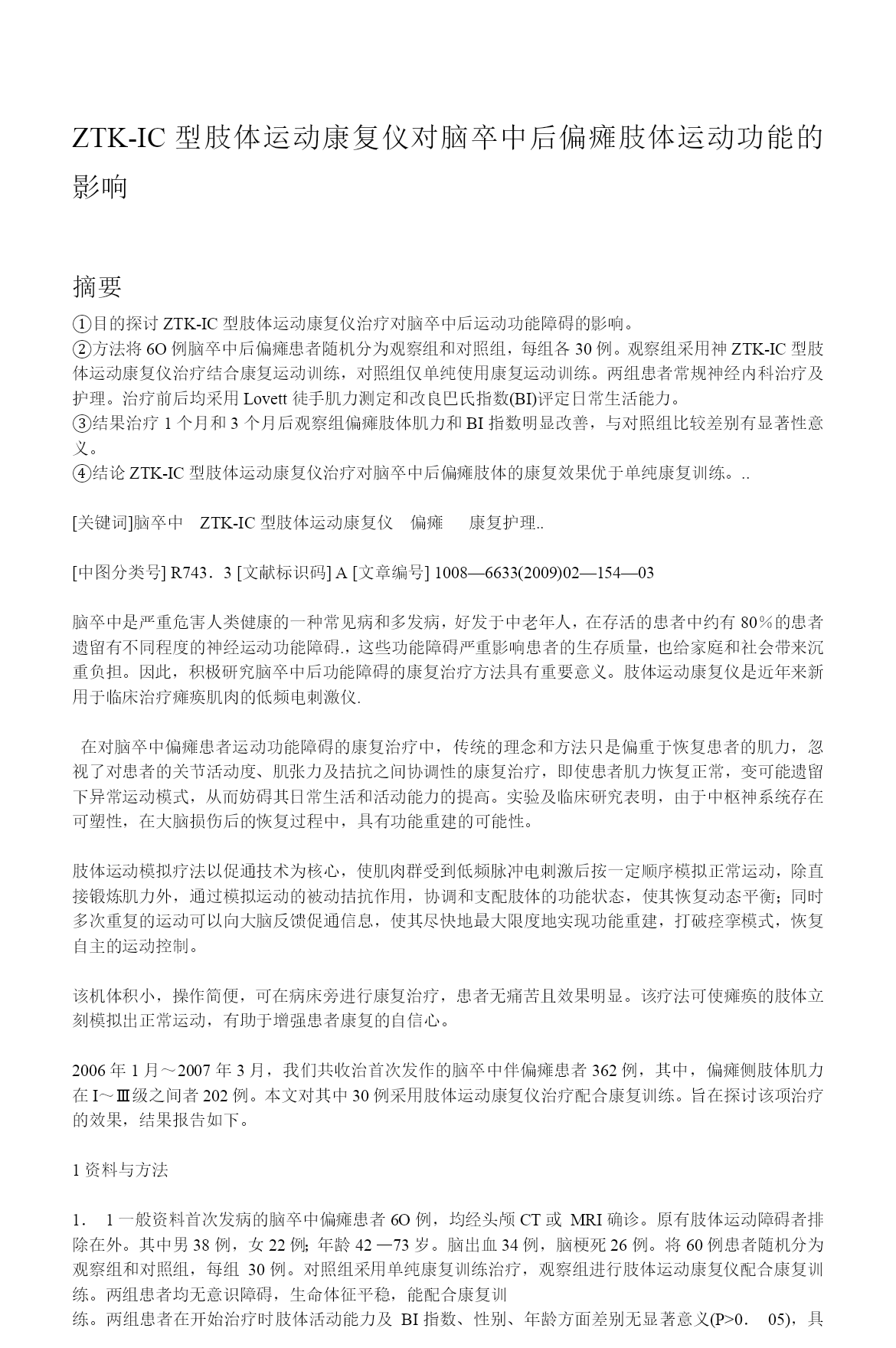 ZTK-IC型肢体运动康复仪对脑卒中后偏瘫肢体运动功能的影响.doc