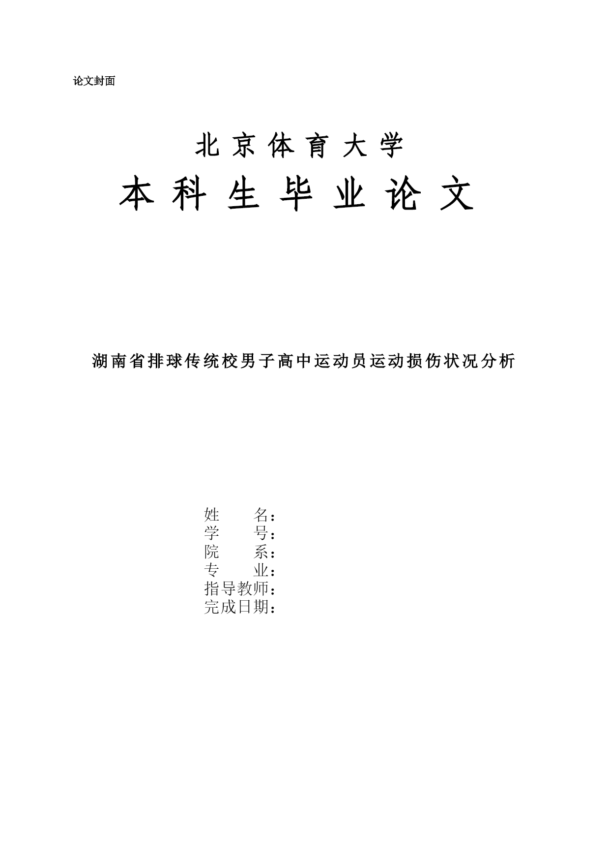 论文封面北京体育大学本科生毕业论文湖南省排球传统校男子高中运动员运动损伤状况分析姓名:学号:院系:专业:指导教师:完成日期:目录中(英)文TOC\o"1-3"\h\uHYPERLINK\l_Toc27301摘要PAGEREF_Toc273011HYPERLINK\l_Toc10887前言PAGEREF_Toc108872HYPERLINK\l_Toc162311运动损伤分布状况及程度PAGEREF_Toc162312HYPERLINK\l_Toc123231.1