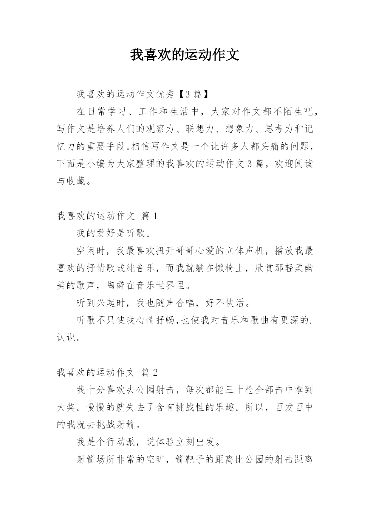 我喜欢的运动作文我喜欢的运动作文优秀【3篇】在日常学习、工作和生活中,大家对作文都不陌生吧,写作文是培养人们的观察力、联想力、想象力、思考力和记忆力的重要手段。相信写作文是一个让许多人都头痛的问题,下面是小编为大家整理的我喜欢的运动作文3篇,欢迎阅读与收藏。我喜欢的运动作文篇1我的爱好是听歌。空闲时,我最喜欢扭开哥哥心爱的立体声机,播放我最喜欢的抒情歌或纯音乐,而我就躺在懒椅上,欣赏那轻柔幽美的歌声,陶醉在音乐世界里。听到兴起时,我也随声合唱,好不快活。听歌不只使我心情抒畅,也使我对音乐和歌曲有更深的.认