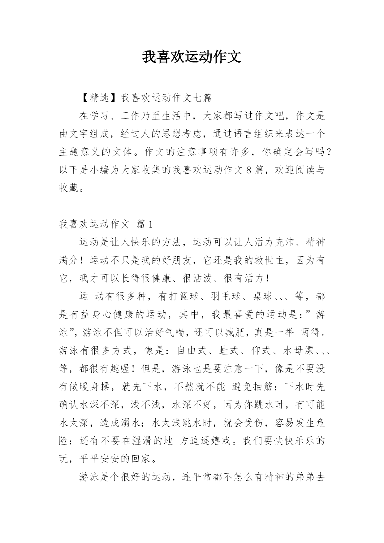 我喜欢运动作文【精选】我喜欢运动作文七篇在学习、工作乃至生活中,大家都写过作文吧,作文是由文字组成,经过人的思想考虑,通过语言组织来表达一个主题意义的文体。作文的注意事项有许多,你确定会写吗?以下是小编为大家收集的我喜欢运动作文8篇,欢迎阅读与收藏。我喜欢运动作文篇1运动是让人快乐的方法,运动可以让人活力充沛、精神满分!运动不只是我的好朋友,它还是我的救世主,因为有它,我才可以长得很健康、很活泼、很有活力!运动有很多种,有打篮球、羽毛球、桌球、、、等,都是有益身心健康的运动,其中,我最喜爱的运动是:”游泳
