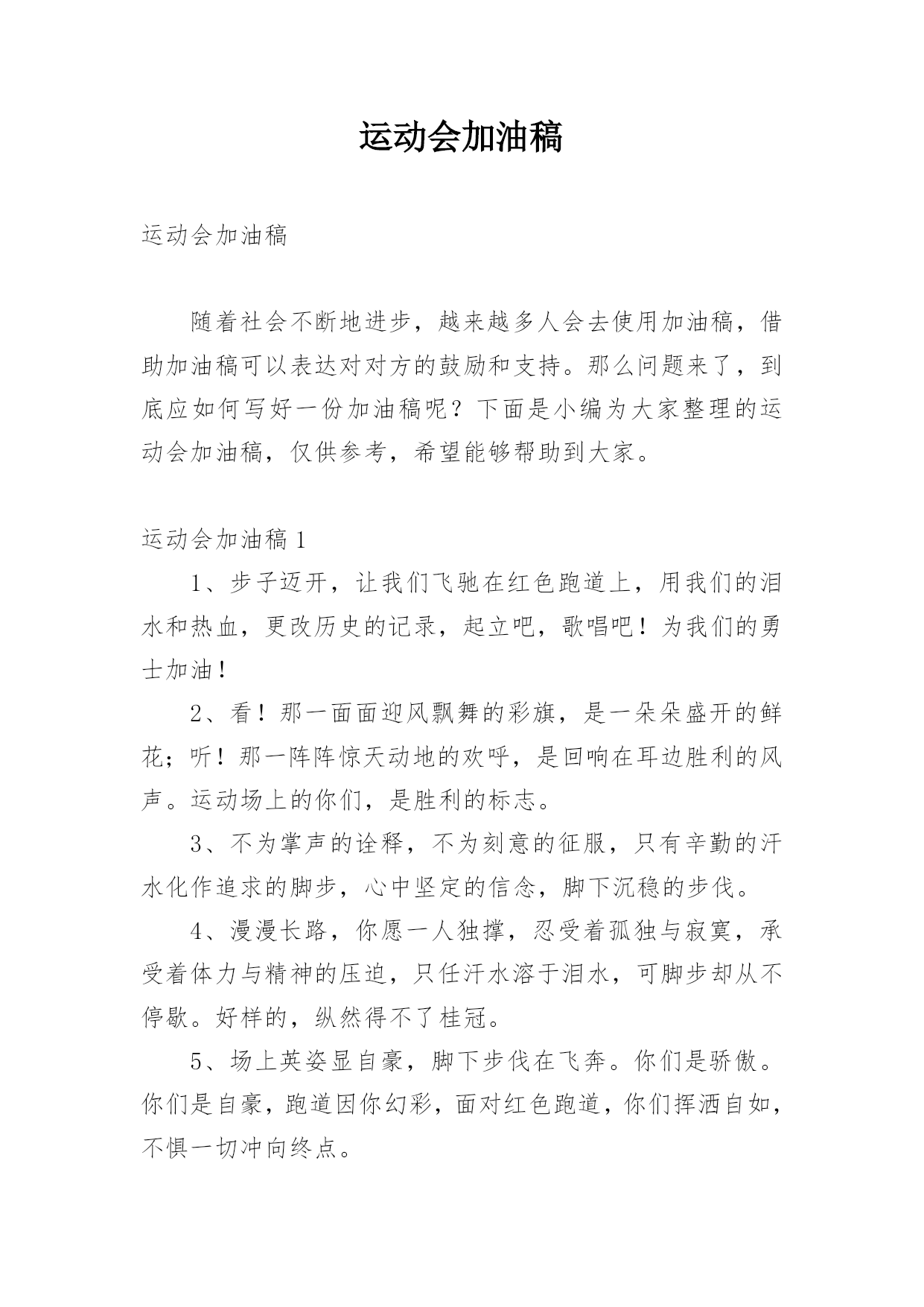 运动会加油稿运动会加油稿随着社会不断地进步,越来越多人会去使用加油稿,借助加油稿可以表达对对方的鼓励和支持。那么问题来了,到底应如何写好一份加油稿呢?下面是小编为大家整理的运动会加油稿,仅供参考,希望能够帮助到大家。运动会加油稿11、步子迈开,让我们飞驰在红色跑道上,用我们的泪水和热血,更改历史的记录,起立吧,歌唱吧!为我们的勇士加油!2、看!那一面面迎风飘舞的彩旗,是一朵朵盛开的鲜花;听!那一阵阵惊天动地的欢呼,是回响在耳边胜利的风声。运动场上的你们,是胜利的标志。3、不为掌声的诠释,不为刻意的征服,只