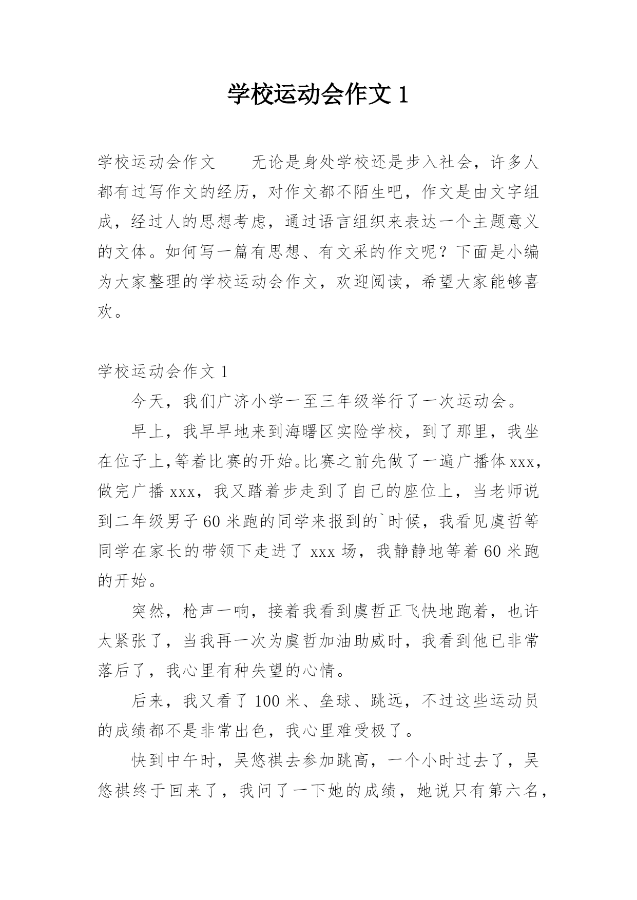 学校运动会作文1学校运动会作文无论是身处学校还是步入社会,许多人都有过写作文的经历,对作文都不陌生吧,作文是由文字组成,经过人的思想考虑,通过语言组织来表达一个主题意义的文体。如何写一篇有思想、有文采的作文呢?下面是小编为大家整理的学校运动会作文,欢迎阅读,希望大家能够喜欢。学校运动会作文1今天,我们广济小学一至三年级举行了一次运动会。早上,我早早地来到海曙区实险学校,到了那里,我坐在位子上,等着比赛的开始。比赛之前先做了一遍广播体xxx,做完广播xxx,我又踏着步走到了自己的座位上,当老师说到二年级男子