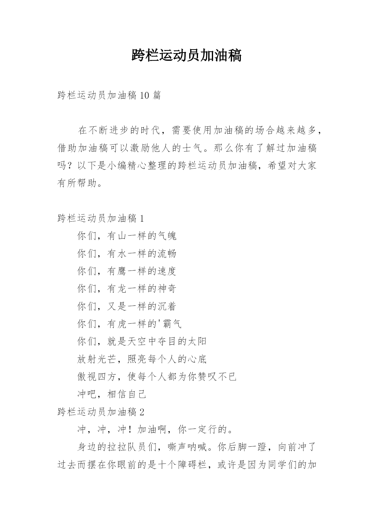 跨栏运动员加油稿跨栏运动员加油稿10篇在不断进步的时代,需要使用加油稿的场合越来越多,借助加油稿可以激励他人的士气。那么你有了解过加油稿吗?以下是小编精心整理的跨栏运动员加油稿,希望对大家有所帮助。跨栏运动员加油稿1你们,有山一样的气魄你们,有水一样的流畅你们,有鹰一样的速度你们,有龙一样的神奇你们,又是一样的沉着你们,有虎一样的'霸气你们,就是天空中夺目的太阳放射光芒,照亮每个人的心底傲视四方,使每个人都为你赞叹不已冲吧,相信自己跨栏运动员加油稿2冲,冲,冲!加油啊,你一定行的。身边的拉拉队员们,嘶声呐