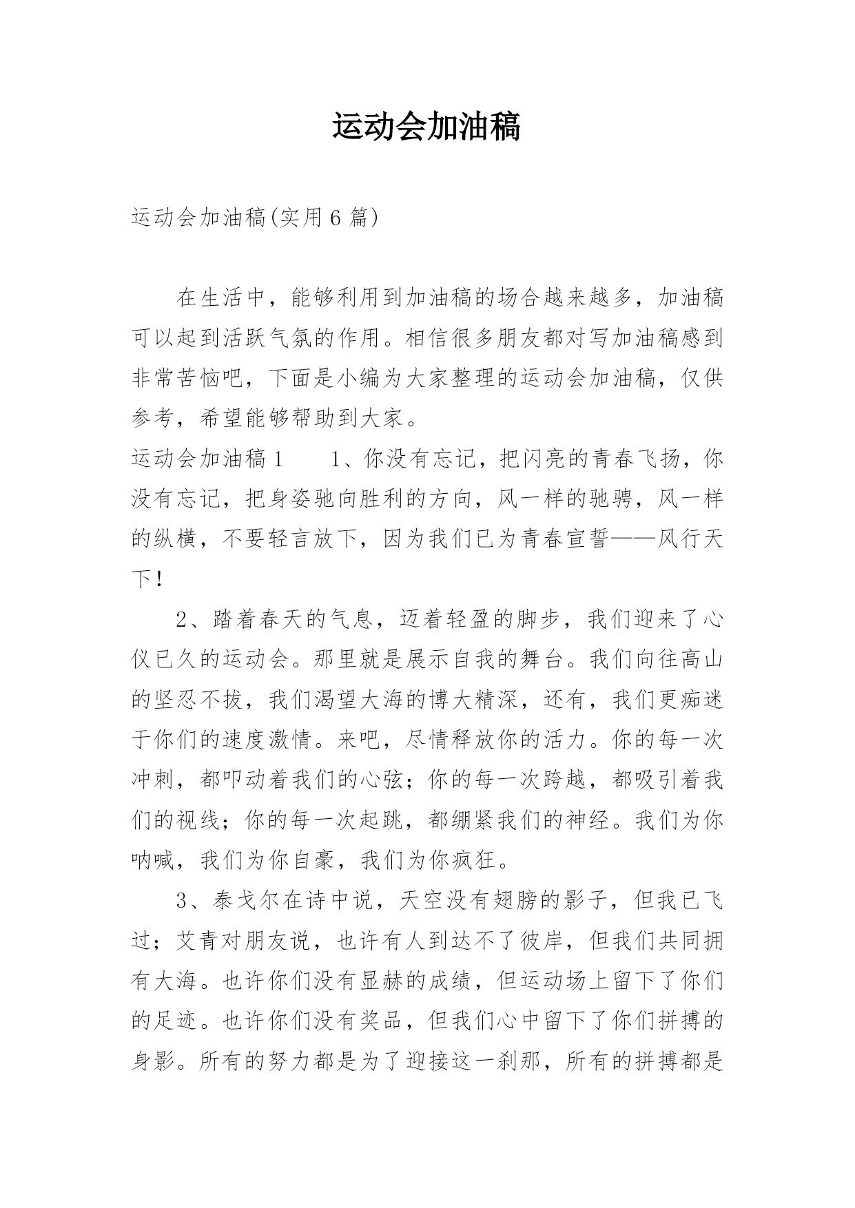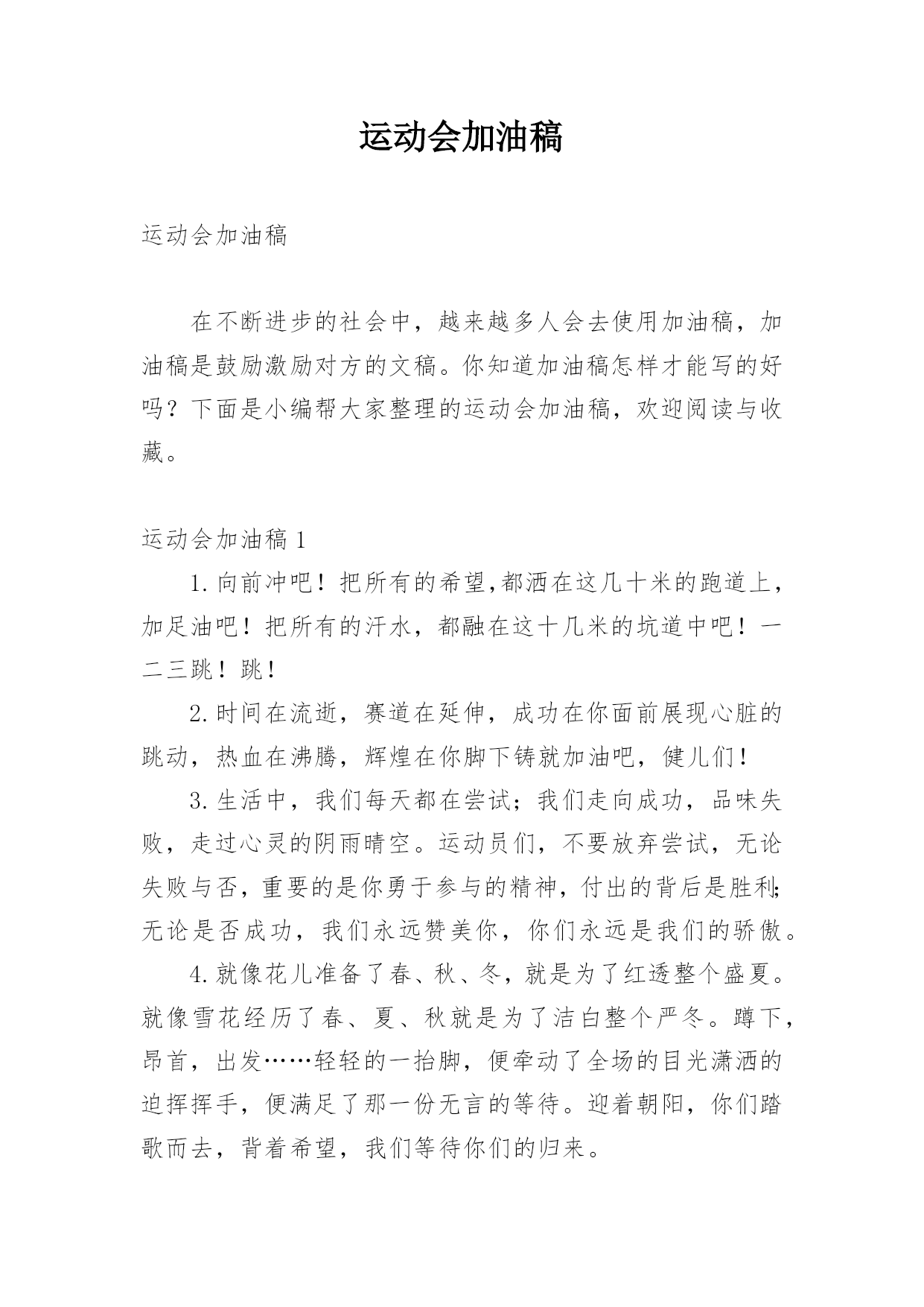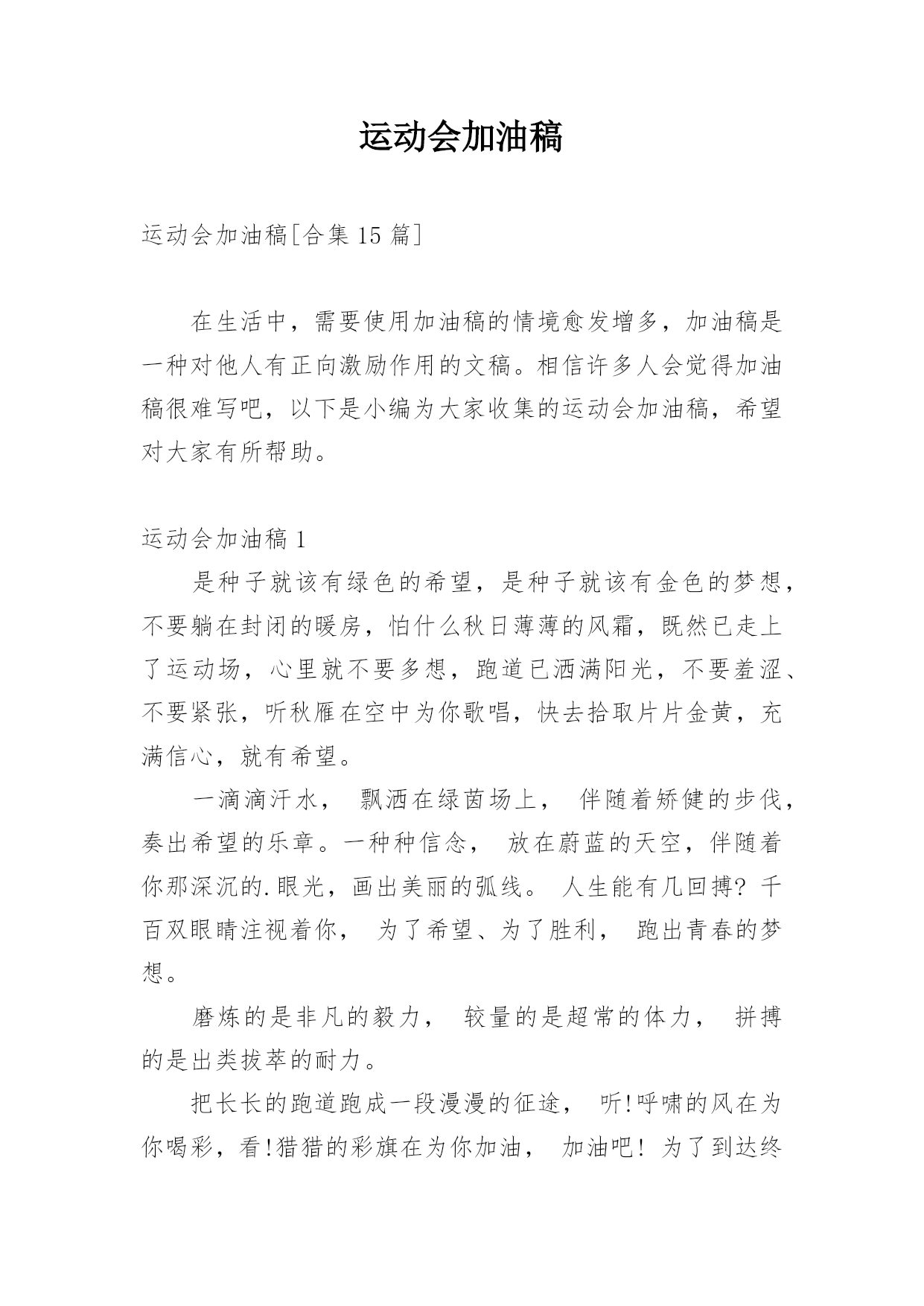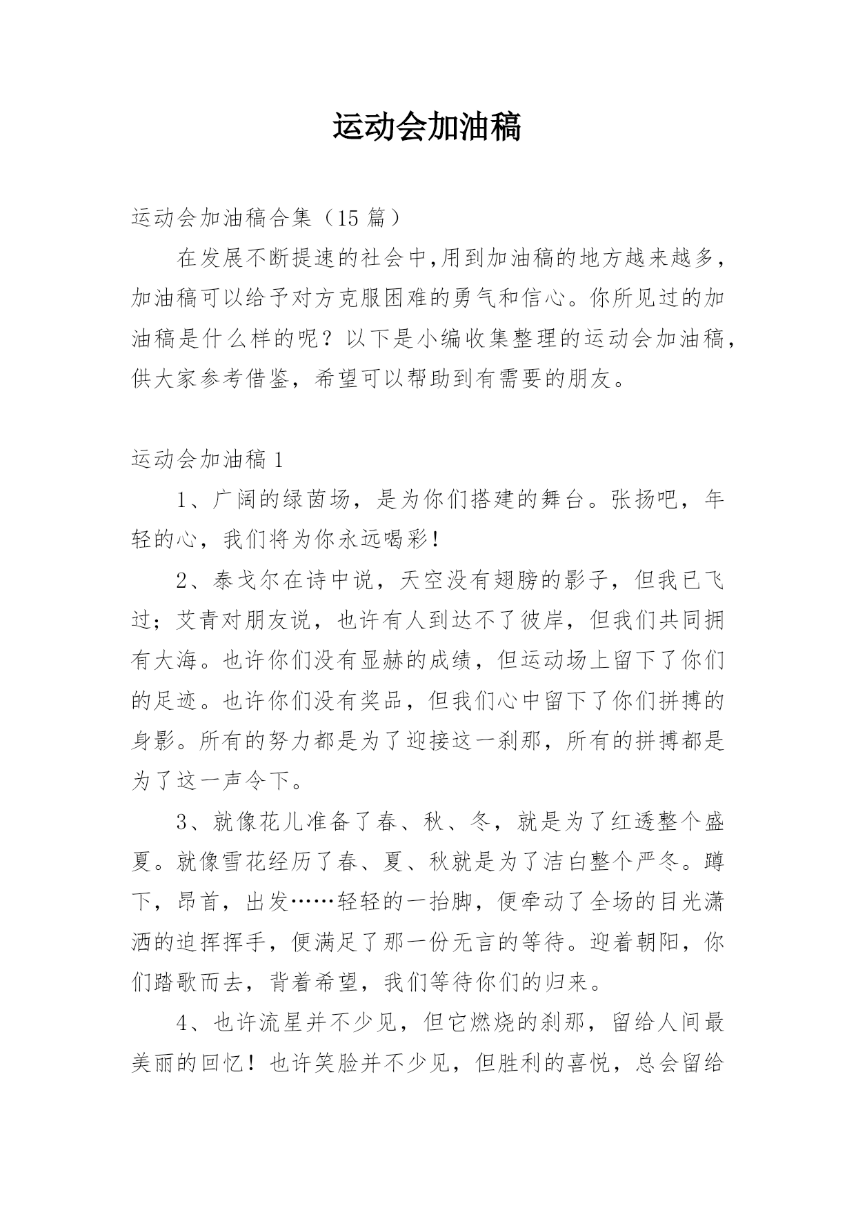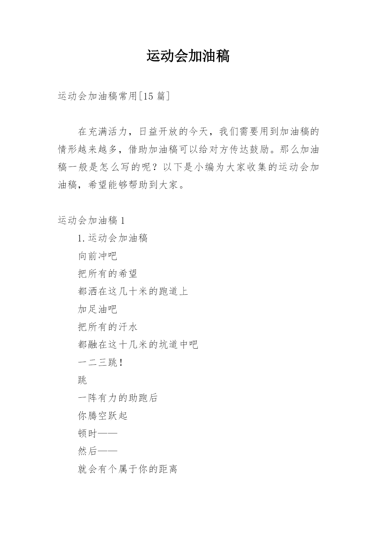 运动会加油稿运动会加油稿常用[15篇]在充满活力,日益开放的今天,我们需要用到加油稿的情形越来越多,借助加油稿可以给对方传达鼓励。那么加油稿一般是怎么写的呢?以下是小编为大家收集的运动会加油稿,希望能够帮助到大家。运动会加油稿11.运动会加油稿向前冲吧把所有的希望都洒在这几十米的跑道上加足油吧把所有的汗水都融在这十几米的坑道中吧一二三跳!跳一阵有力的助跑后你腾空跃起顿时——然后——就会有个属于你的距离无论远近都是青春的风采无论胜负都是动人的旋律2.运动会加油稿好似猛虎跳闸恰似虎跃深潭你这奋力一跃犹如天堂一