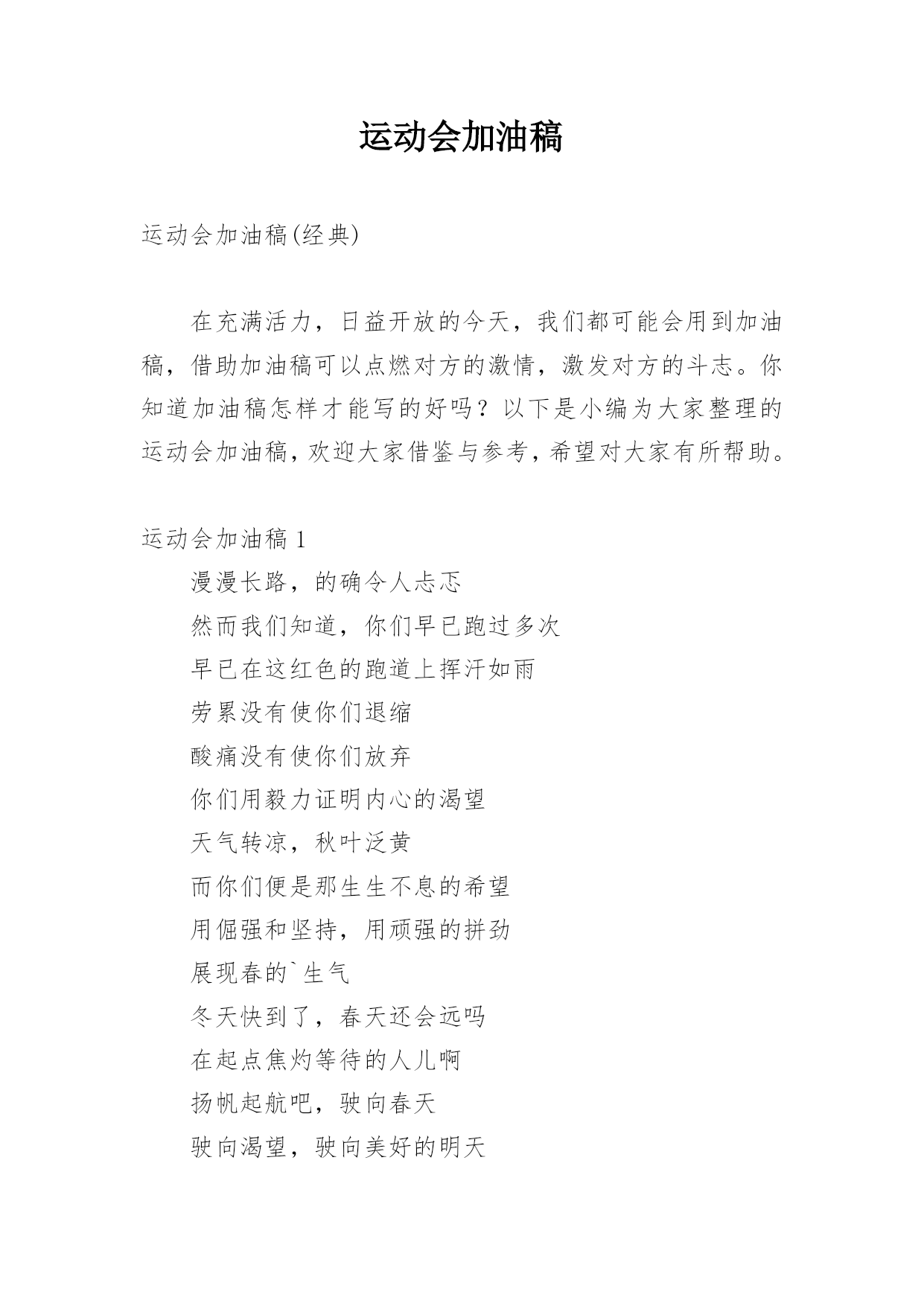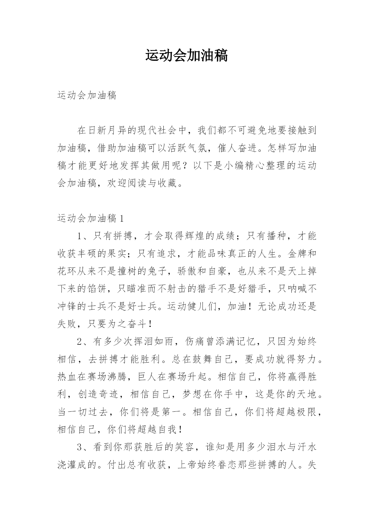 运动会加油稿运动会加油稿在日新月异的现代社会中,我们都不可避免地要接触到加油稿,借助加油稿可以活跃气氛,催人奋进。怎样写加油稿才能更好地发挥其做用呢?以下是小编精心整理的运动会加油稿,欢迎阅读与收藏。运动会加油稿11、只有拼搏,才会取得辉煌的成绩;只有播种,才能收获丰硕的果实;只有追求,才能品味真正的人生。金牌和花环从来不是撞树的兔子,骄傲和自豪,也从来不是天上掉下来的馅饼,只瞄准而不射击的猎手不是好猎手,只呐喊不冲锋的士兵不是好士兵。运动健儿们,加油!无论成功还是失败,只要为之奋斗!2、有多少次挥泪如雨