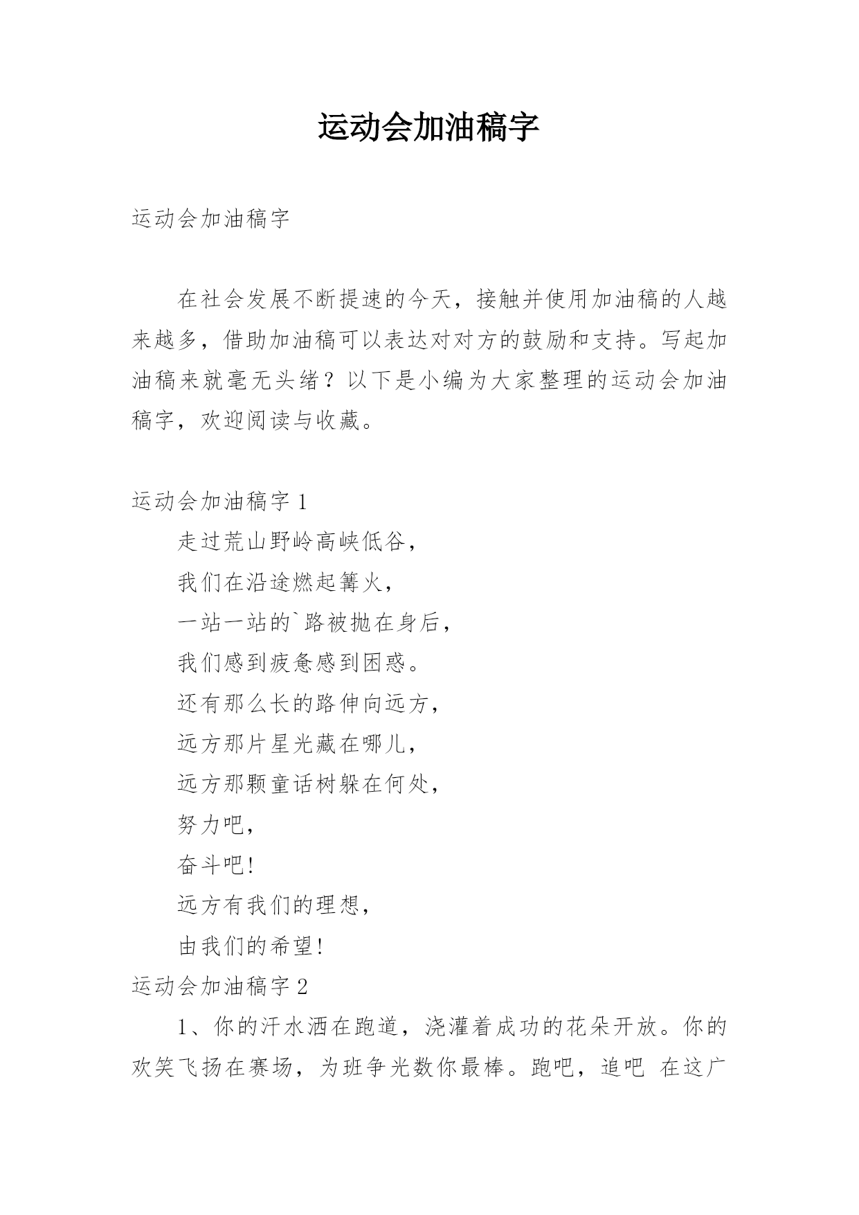 运动会加油稿字运动会加油稿字在社会发展不断提速的今天,接触并使用加油稿的人越来越多,借助加油稿可以表达对对方的鼓励和支持。写起加油稿来就毫无头绪?以下是小编为大家整理的运动会加油稿字,欢迎阅读与收藏。运动会加油稿字1走过荒山野岭高峡低谷,我们在沿途燃起篝火,一站一站的`路被抛在身后,我们感到疲惫感到困惑。还有那么长的路伸向远方,远方那片星光藏在哪儿,远方那颗童话树躲在何处,努力吧,奋斗吧!远方有我们的理想,由我们的希望!运动会加油稿字21、你的汗水洒在跑道,浇灌着成功的花朵开放。你的欢笑飞扬在赛场,为班争