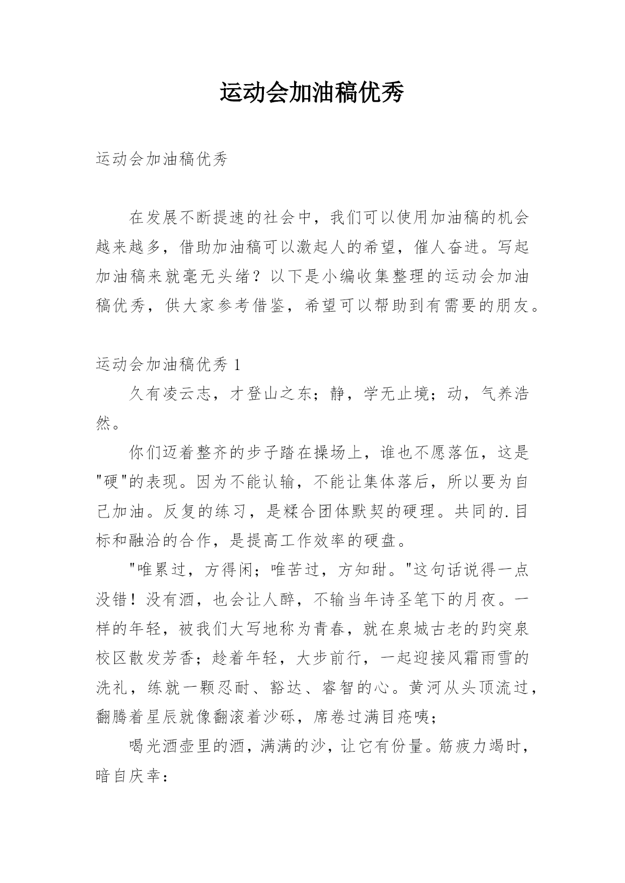 运动会加油稿优秀运动会加油稿优秀在发展不断提速的社会中,我们可以使用加油稿的机会越来越多,借助加油稿可以激起人的希望,催人奋进。写起加油稿来就毫无头绪?以下是小编收集整理的运动会加油稿优秀,供大家参考借鉴,希望可以帮助到有需要的朋友。运动会加油稿优秀1久有凌云志,才登山之东;静,学无止境;动,气养浩然。你们迈着整齐的步子踏在操场上,谁也不愿落伍,这是"硬"的表现。因为不能认输,不能让集体落后,所以要为自己加油。反复的练习,是糅合团体默契的硬理。共同的.目标和融洽的合作,是提高工作效率的硬盘。"唯累过,方得