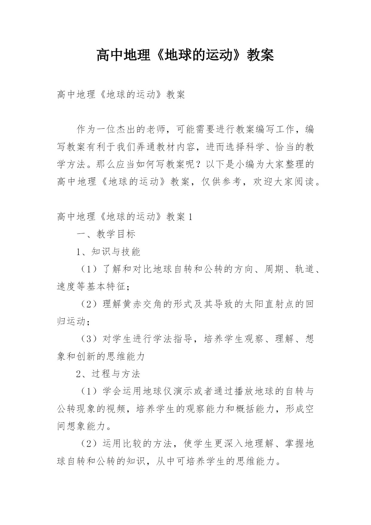 高中地理《地球的运动》教案高中地理《地球的运动》教案作为一位杰出的老师,可能需要进行教案编写工作,编写教案有利于我们弄通教材内容,进而选择科学、恰当的教学方法。那么应当如何写教案呢?以下是小编为大家整理的高中地理《地球的运动》教案,仅供参考,欢迎大家阅读。高中地理《地球的运动》教案1一、教学目标1、知识与技能(1)了解和对比地球自转和公转的方向、周期、轨道、速度等基本特征;(2)理解黄赤交角的形式及其导致的太阳直射点的回归运动;(3)对学生进行学法指导,培养学生观察、理解、想象和创新的思维能力2、过程与方