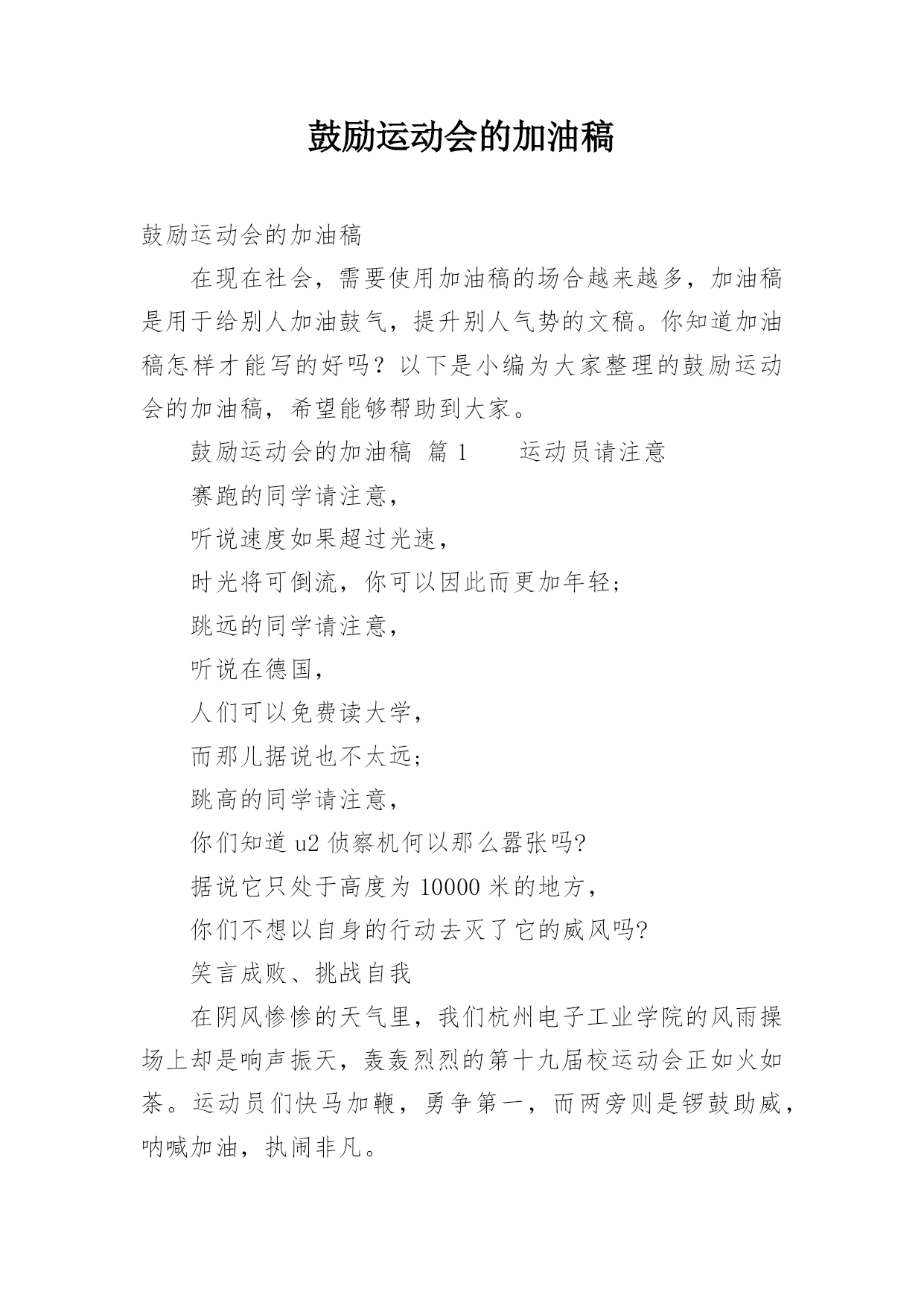 鼓励运动会的加油稿鼓励运动会的加油稿在现在社会,需要使用加油稿的场合越来越多,加油稿是用于给别人加油鼓气,提升别人气势的文稿。你知道加油稿怎样才能写的好吗?以下是小编为大家整理的鼓励运动会的加油稿,希望能够帮助到大家。鼓励运动会的加油稿篇1运动员请注意赛跑的同学请注意,听说速度如果超过光速,时光将可倒流,你可以因此而更加年轻;跳远的同学请注意,听说在德国,人们可以免费读大学,而那儿据说也不太远;跳高的同学请注意,你们知道u2侦察机何以那么嚣张吗?据说它只处于高度为10000米的地方,你们不想以自身的行动去