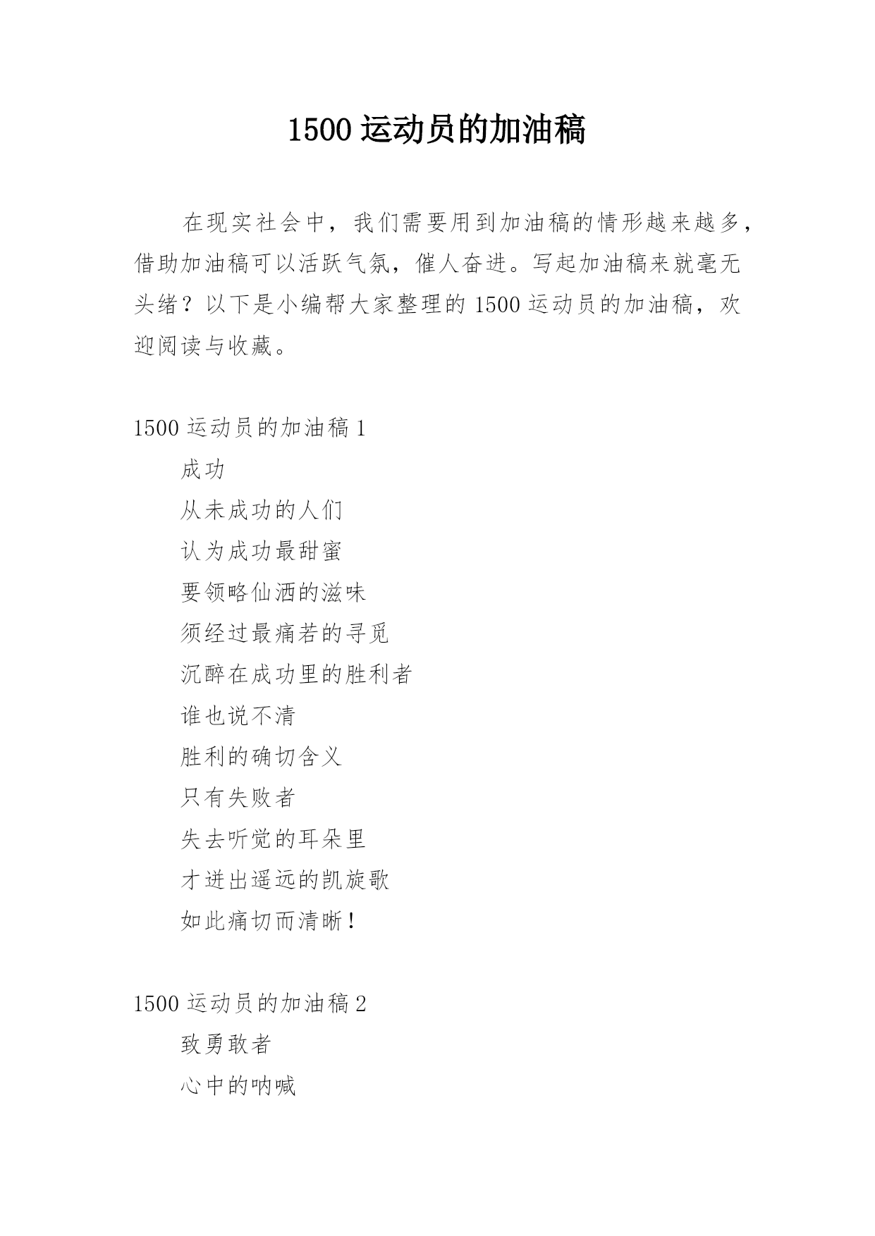 1500运动员的加油稿在现实社会中,我们需要用到加油稿的情形越来越多,借助加油稿可以活跃气氛,催人奋进。写起加油稿来就毫无头绪?以下是小编帮大家整理的1500运动员的加油稿,欢迎阅读与收藏。1500运动员的加油稿1成功从未成功的人们认为成功最甜蜜要领略仙洒的滋味须经过最痛若的寻觅沉醉在成功里的胜利者谁也说不清胜利的确切含义只有失败者失去听觉的耳朵里才迸出遥远的凯旋歌如此痛切而清晰!1500运动员的加油稿2致勇敢者心中的呐喊在遥远的地方响起是人生的高歌是人生的狂啸勇敢者的身影穿梭在运动场上年轻的心鼓成一张白