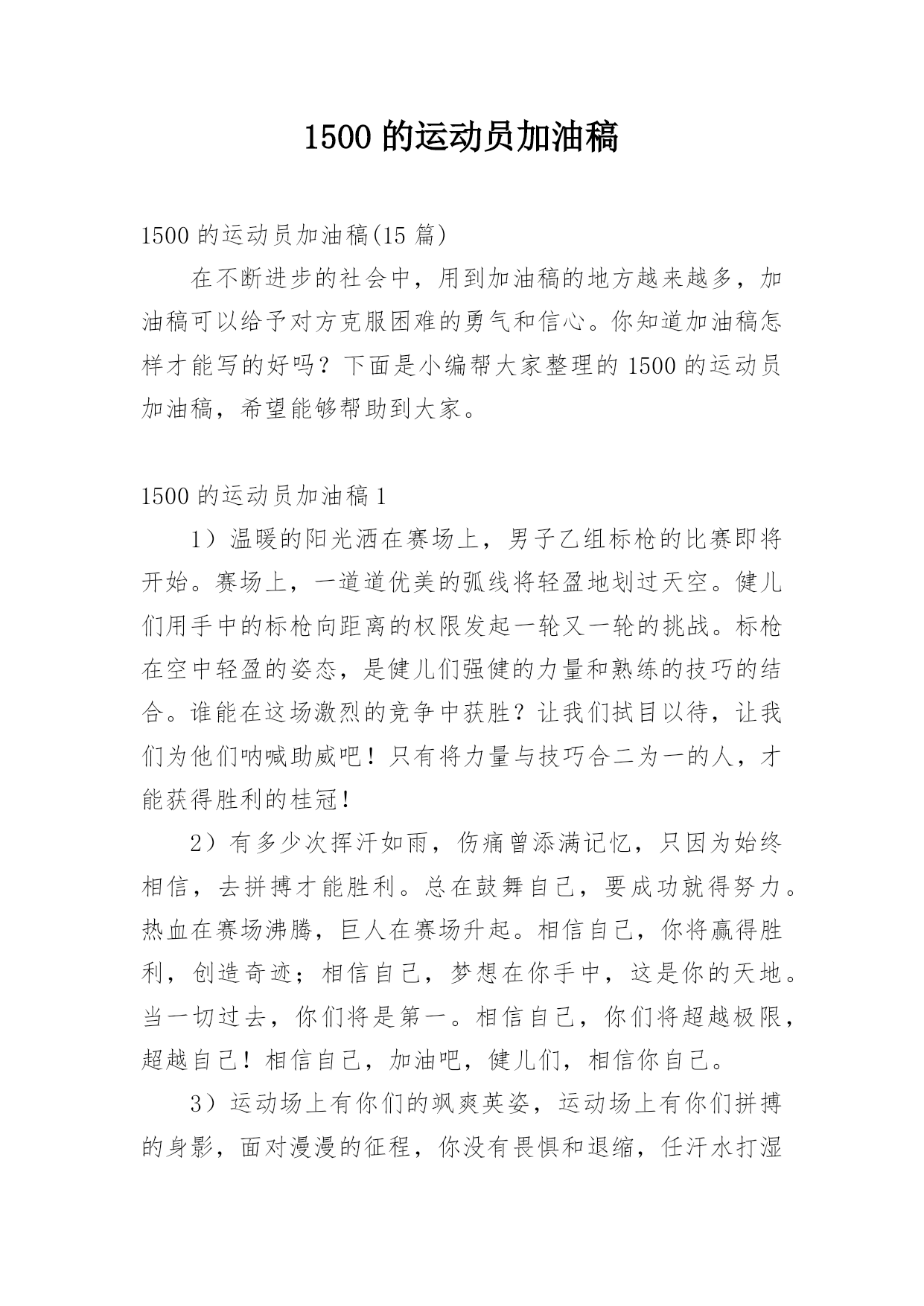 1500的运动员加油稿1500的运动员加油稿(15篇)在不断进步的社会中,用到加油稿的地方越来越多,加油稿可以给予对方克服困难的勇气和信心。你知道加油稿怎样才能写的好吗?下面是小编帮大家整理的1500的运动员加油稿,希望能够帮助到大家。1500的运动员加油稿11)温暖的阳光洒在赛场上,男子乙组标枪的比赛即将开始。赛场上,一道道优美的弧线将轻盈地划过天空。健儿们用手中的标枪向距离的权限发起一轮又一轮的挑战。标枪在空中轻盈的姿态,是健儿们强健的力量和熟练的技巧的结合。谁能在这场激烈的竞争中获胜?让我们拭目以待