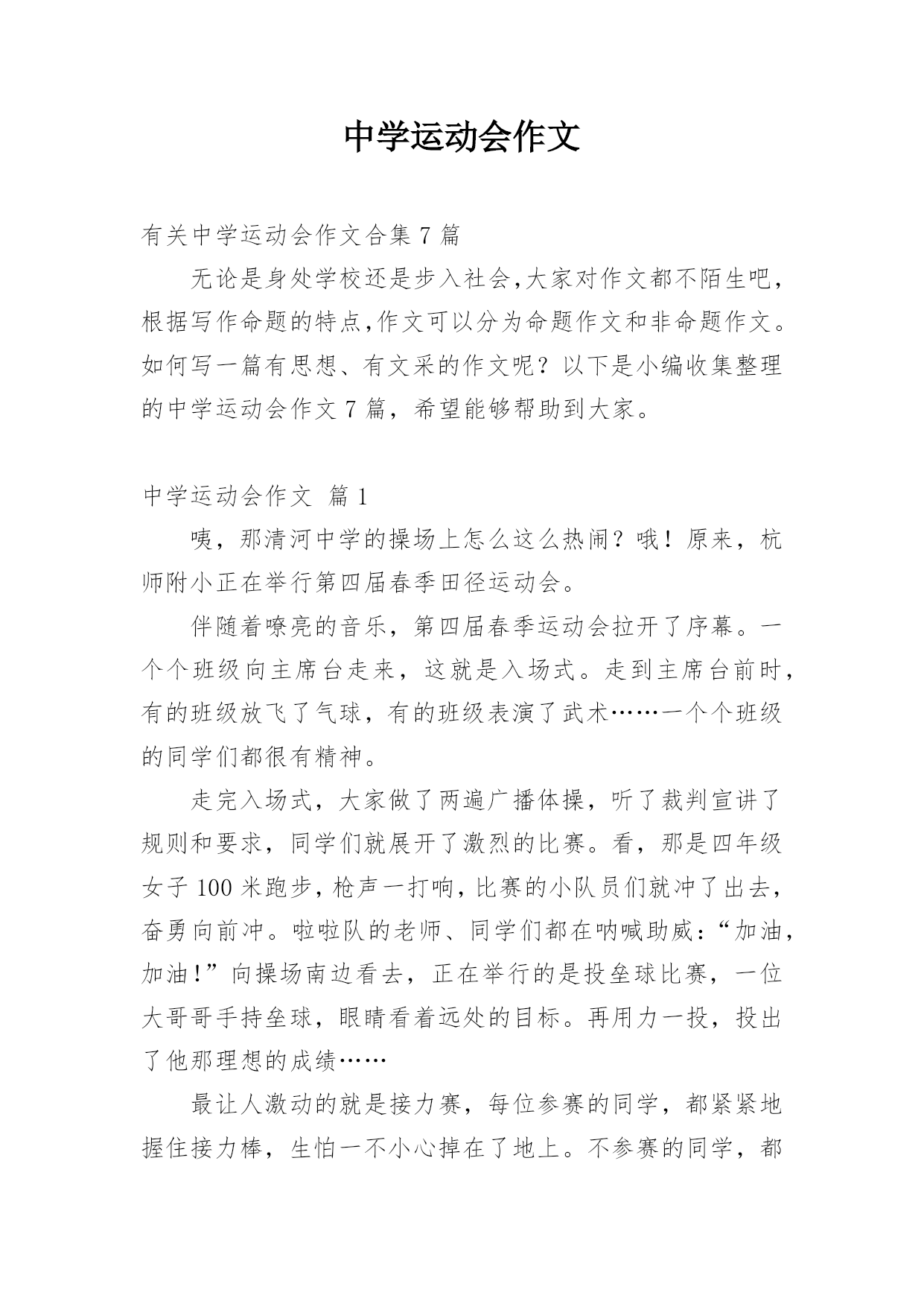 中学运动会作文有关中学运动会作文合集7篇无论是身处学校还是步入社会,大家对作文都不陌生吧,根据写作命题的特点,作文可以分为命题作文和非命题作文。如何写一篇有思想、有文采的作文呢?以下是小编收集整理的中学运动会作文7篇,希望能够帮助到大家。中学运动会作文篇1咦,那清河中学的操场上怎么这么热闹?哦!原来,杭师附小正在举行第四届春季田径运动会。伴随着嘹亮的音乐,第四届春季运动会拉开了序幕。一个个班级向主席台走来,这就是入场式。走到主席台前时,有的班级放飞了气球,有的班级表演了武术……一个个班级的同学们都很有精神