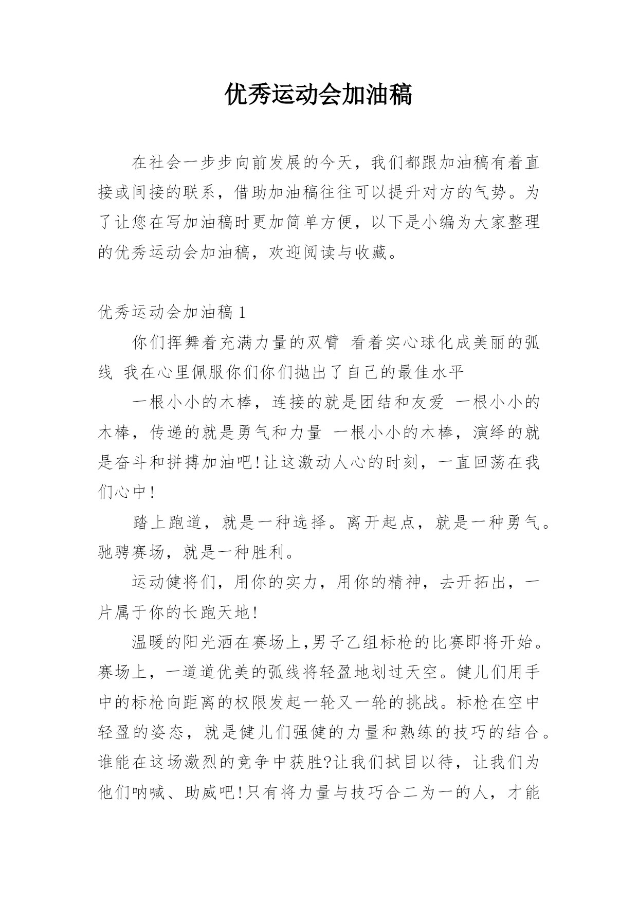 优秀运动会加油稿在社会一步步向前发展的今天,我们都跟加油稿有着直接或间接的联系,借助加油稿往往可以提升对方的气势。为了让您在写加油稿时更加简单方便,以下是小编为大家整理的优秀运动会加油稿,欢迎阅读与收藏。优秀运动会加油稿1你们挥舞着充满力量的双臂看着实心球化成美丽的弧线我在心里佩服你们你们抛出了自己的最佳水平一根小小的木棒,连接的就是团结和友爱一根小小的木棒,传递的就是勇气和力量一根小小的木棒,演绎的就是奋斗和拼搏加油吧!让这激动人心的时刻,一直回荡在我们心中!踏上跑道,就是一种选择。离开起点,就是一种勇