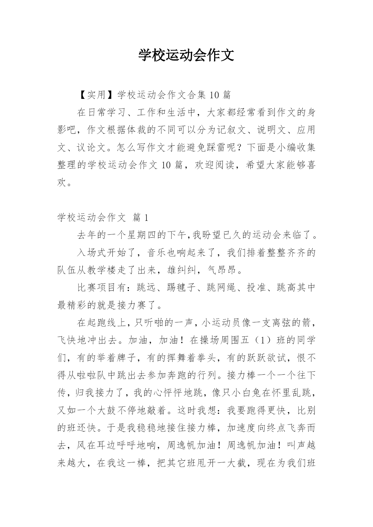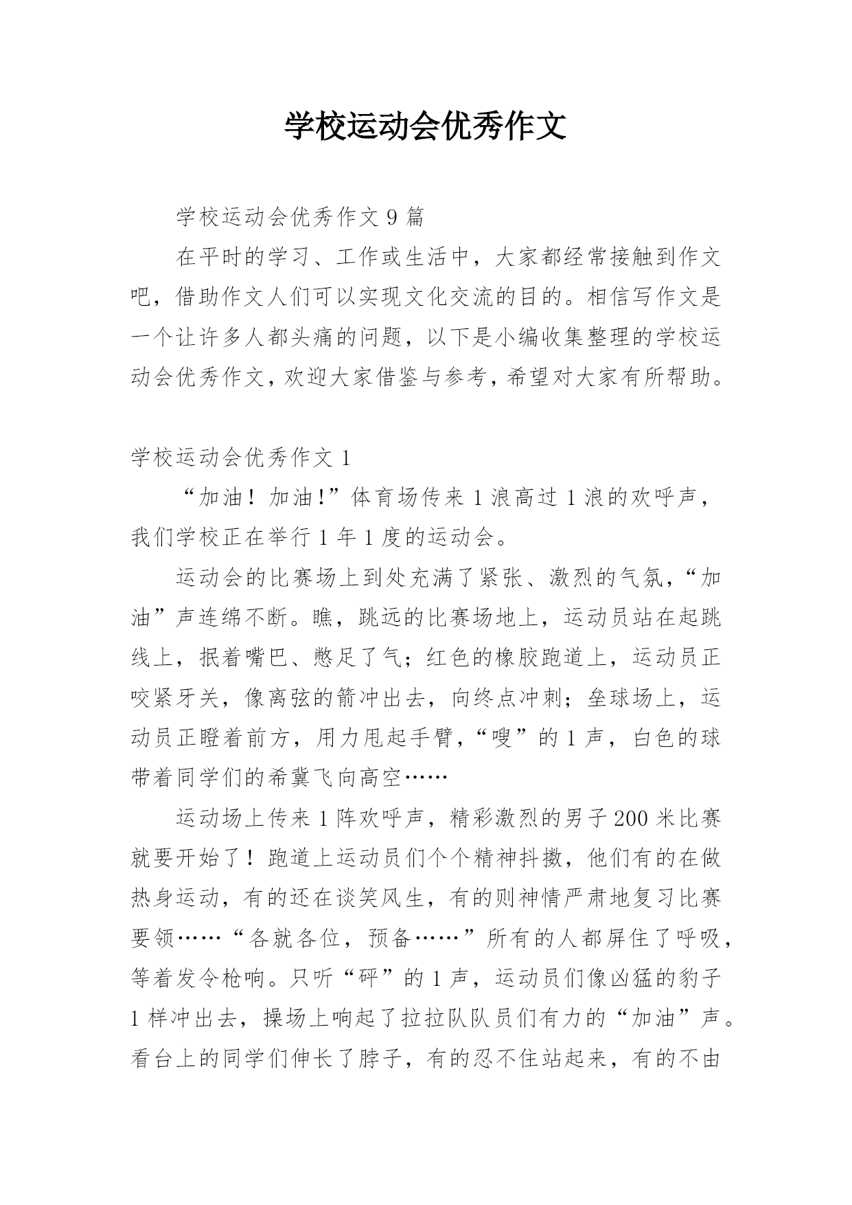 学校运动会优秀作文学校运动会优秀作文9篇在平时的学习、工作或生活中,大家都经常接触到作文吧,借助作文人们可以实现文化交流的目的。相信写作文是一个让许多人都头痛的问题,以下是小编收集整理的学校运动会优秀作文,欢迎大家借鉴与参考,希望对大家有所帮助。学校运动会优秀作文1“加油!加油!”体育场传来1浪高过1浪的欢呼声,我们学校正在举行1年1度的运动会。运动会的比赛场上到处充满了紧张、激烈的气氛,“加油”声连绵不断。瞧,跳远的比赛场地上,运动员站在起跳线上,抿着嘴巴、憋足了气;红色的橡胶跑道上,运动员正咬紧牙关,