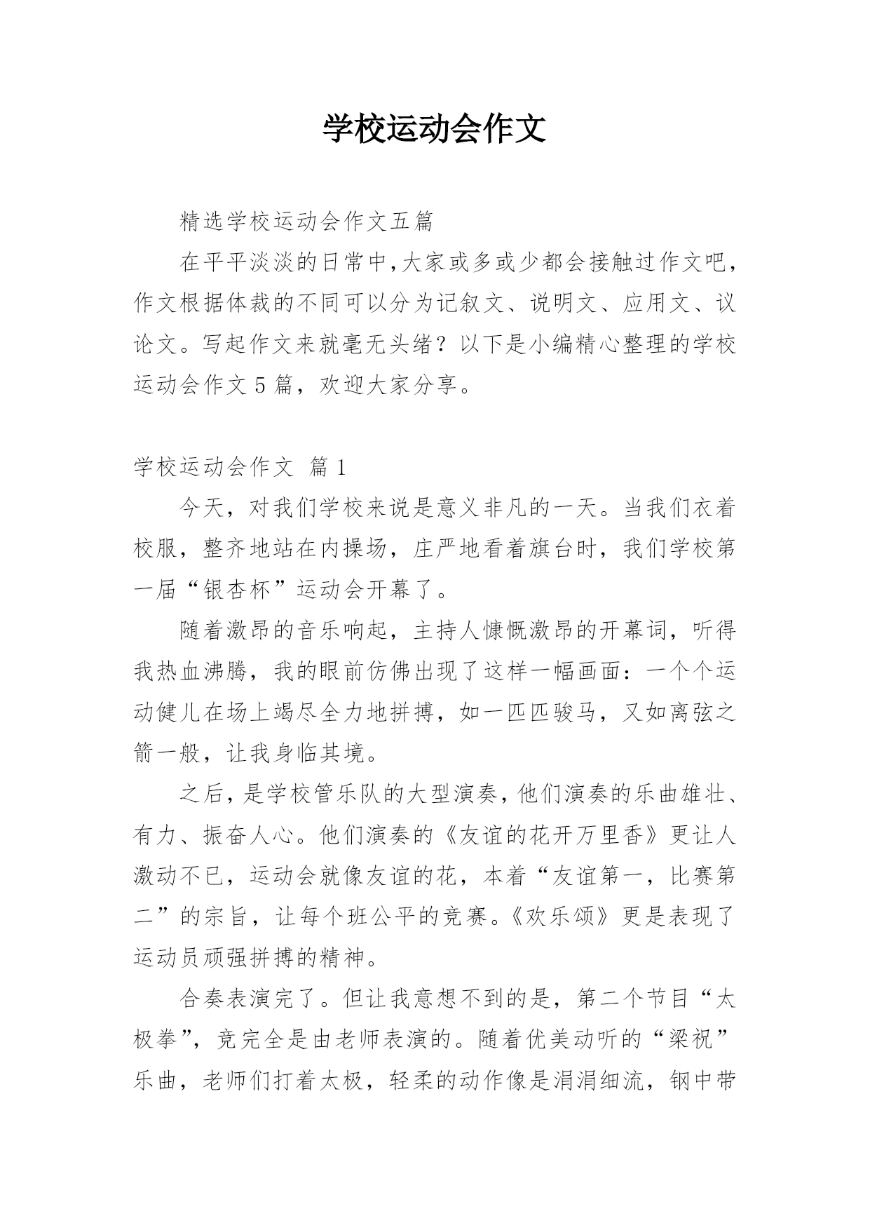 学校运动会作文精选学校运动会作文五篇在平平淡淡的日常中,大家或多或少都会接触过作文吧,作文根据体裁的不同可以分为记叙文、说明文、应用文、议论文。写起作文来就毫无头绪?以下是小编精心整理的学校运动会作文5篇,欢迎大家分享。学校运动会作文篇1今天,对我们学校来说是意义非凡的一天。当我们衣着校服,整齐地站在内操场,庄严地看着旗台时,我们学校第一届“银杏杯”运动会开幕了。随着激昂的音乐响起,主持人慷慨激昂的开幕词,听得我热血沸腾,我的眼前仿佛出现了这样一幅画面:一个个运动健儿在场上竭尽全力地拼搏,如一匹匹骏马,又