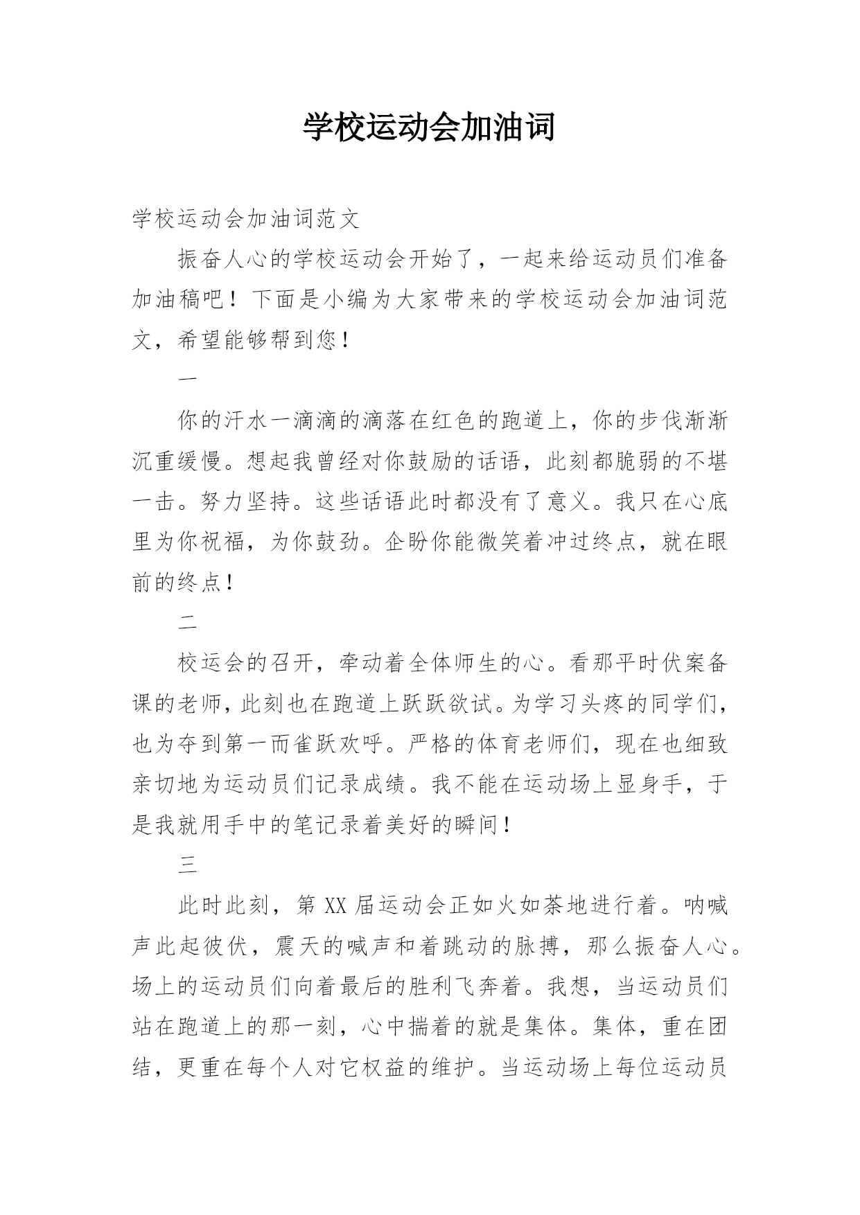 学校运动会加油词学校运动会加油词范文振奋人心的学校运动会开始了,一起来给运动员们准备加油稿吧!下面是小编为大家带来的学校运动会加油词范文,希望能够帮到您!一你的汗水一滴滴的滴落在红色的跑道上,你的步伐渐渐沉重缓慢。想起我曾经对你鼓励的话语,此刻都脆弱的不堪一击。努力坚持。这些话语此时都没有了意义。我只在心底里为你祝福,为你鼓劲。企盼你能微笑着冲过终点,就在眼前的终点!二校运会的召开,牵动着全体师生的心。看那平时伏案备课的老师,此刻也在跑道上跃跃欲试。为学习头疼的同学们,也为夺到第一而雀跃欢呼。严格的体育老