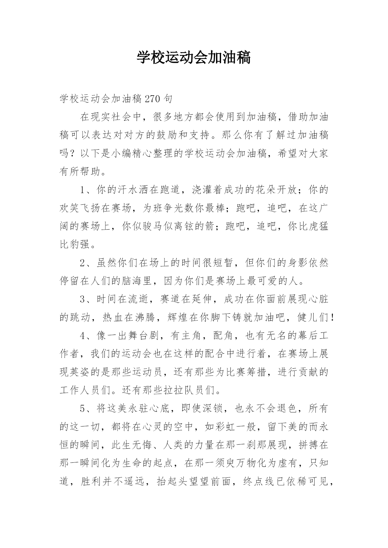 学校运动会加油稿学校运动会加油稿270句在现实社会中,很多地方都会使用到加油稿,借助加油稿可以表达对对方的鼓励和支持。那么你有了解过加油稿吗?以下是小编精心整理的学校运动会加油稿,希望对大家有所帮助。1、你的汗水洒在跑道,浇灌着成功的花朵开放;你的欢笑飞扬在赛场,为班争光数你最棒;跑吧,追吧,在这广阔的赛场上,你似骏马似离铉的箭;跑吧,追吧,你比虎猛比豹强。2、虽然你们在场上的时间很短暂,但你们的身影依然停留在人们的脑海里,因为你们是赛场上最可爱的人。3、时间在流逝,赛道在延伸,成功在你面前展现心脏的跳动