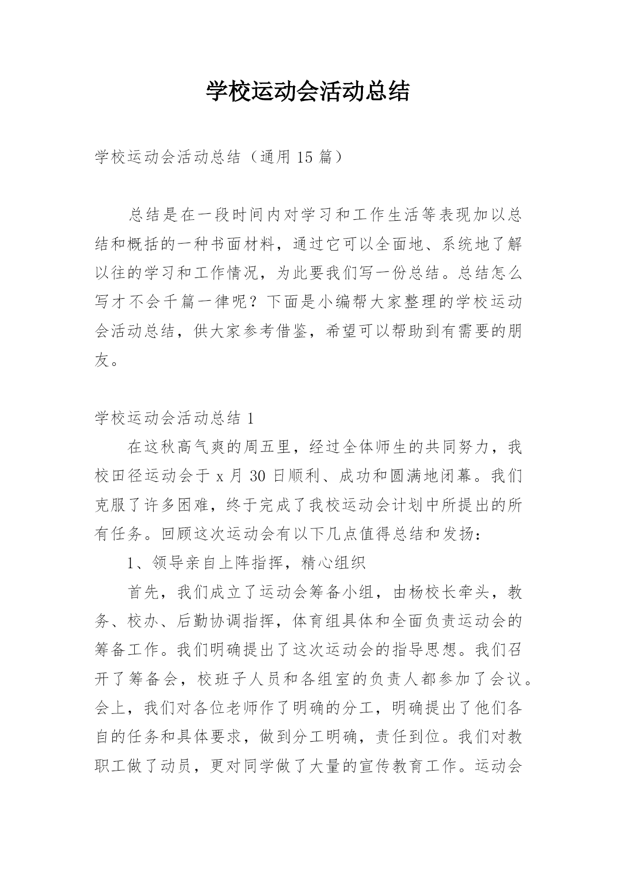 学校运动会活动总结学校运动会活动总结(通用15篇)总结是在一段时间内对学习和工作生活等表现加以总结和概括的一种书面材料,通过它可以全面地、系统地了解以往的学习和工作情况,为此要我们写一份总结。总结怎么写才不会千篇一律呢?下面是小编帮大家整理的学校运动会活动总结,供大家参考借鉴,希望可以帮助到有需要的朋友。学校运动会活动总结1在这秋高气爽的周五里,经过全体师生的共同努力,我校田径运动会于x月30日顺利、成功和圆满地闭幕。我们克服了许多困难,终于完成了我校运动会计划中所提出的所有任务。回顾这次运动会有以下几点