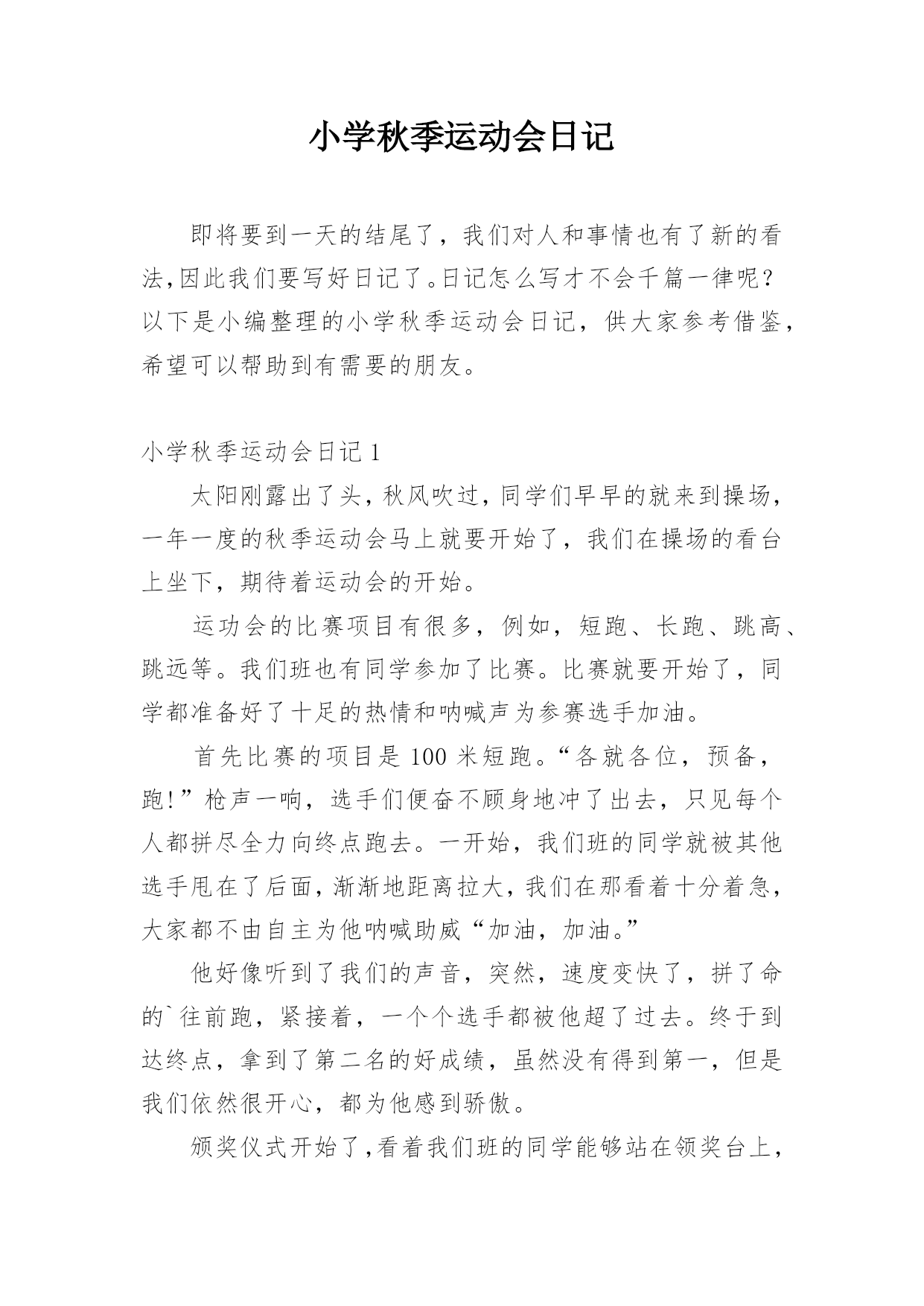 小学秋季运动会日记即将要到一天的结尾了,我们对人和事情也有了新的看法,因此我们要写好日记了。日记怎么写才不会千篇一律呢?以下是小编整理的小学秋季运动会日记,供大家参考借鉴,希望可以帮助到有需要的朋友。小学秋季运动会日记1太阳刚露出了头,秋风吹过,同学们早早的就来到操场,一年一度的秋季运动会马上就要开始了,我们在操场的看台上坐下,期待着运动会的开始。运功会的比赛项目有很多,例如,短跑、长跑、跳高、跳远等。我们班也有同学参加了比赛。比赛就要开始了,同学都准备好了十足的热情和呐喊声为参赛选手加油。首先比赛的项目