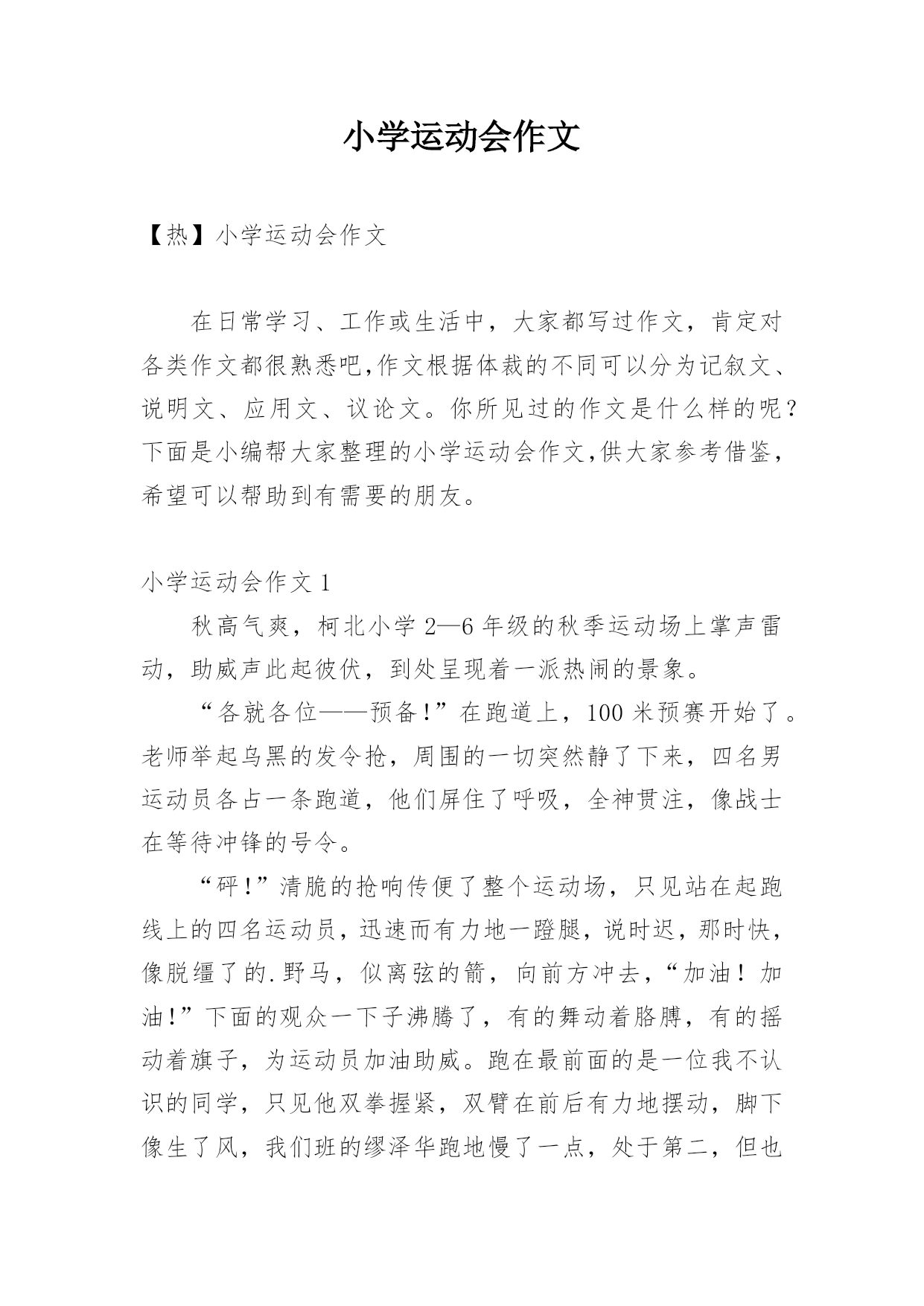 小学运动会作文【热】小学运动会作文在日常学习、工作或生活中,大家都写过作文,肯定对各类作文都很熟悉吧,作文根据体裁的不同可以分为记叙文、说明文、应用文、议论文。你所见过的作文是什么样的呢?下面是小编帮大家整理的小学运动会作文,供大家参考借鉴,希望可以帮助到有需要的朋友。小学运动会作文1秋高气爽,柯北小学2—6年级的秋季运动场上掌声雷动,助威声此起彼伏,到处呈现着一派热闹的景象。“各就各位——预备!”在跑道上,100米预赛开始了。老师举起乌黑的发令抢,周围的一切突然静了下来,四名男运动员各占一条跑道,他们屏