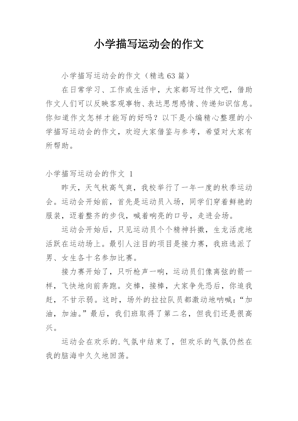 小学描写运动会的作文小学描写运动会的作文(精选63篇)在日常学习、工作或生活中,大家都写过作文吧,借助作文人们可以反映客观事物、表达思想感情、传递知识信息。你知道作文怎样才能写的好吗?以下是小编精心整理的小学描写运动会的作文,欢迎大家借鉴与参考,希望对大家有所帮助。小学描写运动会的作文1昨天,天气秋高气爽,我校举行了一年一度的秋季运动会。运动会开始前,首先是运动员入场,同学们穿着鲜艳的服装,迈着整齐的步伐,喊着响亮的口号,走进会场。运动会开始后,只见运动员个个精神抖擞,生龙活虎地活跃在运动场上。最引人注目