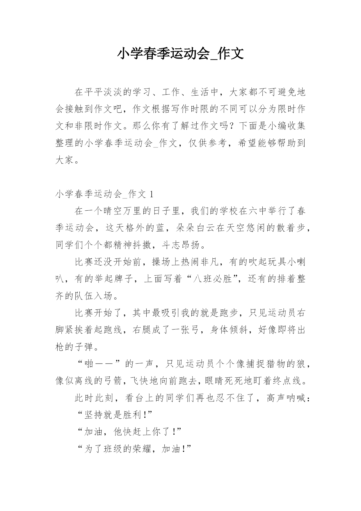 小学春季运动会_作文在平平淡淡的学习、工作、生活中,大家都不可避免地会接触到作文吧,作文根据写作时限的不同可以分为限时作文和非限时作文。那么你有了解过作文吗?下面是小编收集整理的小学春季运动会_作文,仅供参考,希望能够帮助到大家。小学春季运动会_作文1在一个晴空万里的日子里,我们的学校在六中举行了春季运动会,这天格外的蓝,朵朵白云在天空悠闲的散着步,同学们个个都精神抖擞,斗志昂扬。比赛还没开始前,操场上热闹非凡,有的吹起玩具小喇叭,有的举起牌子,上面写着“八班必胜”,还有的排着整齐的队伍入场。比赛开始了,