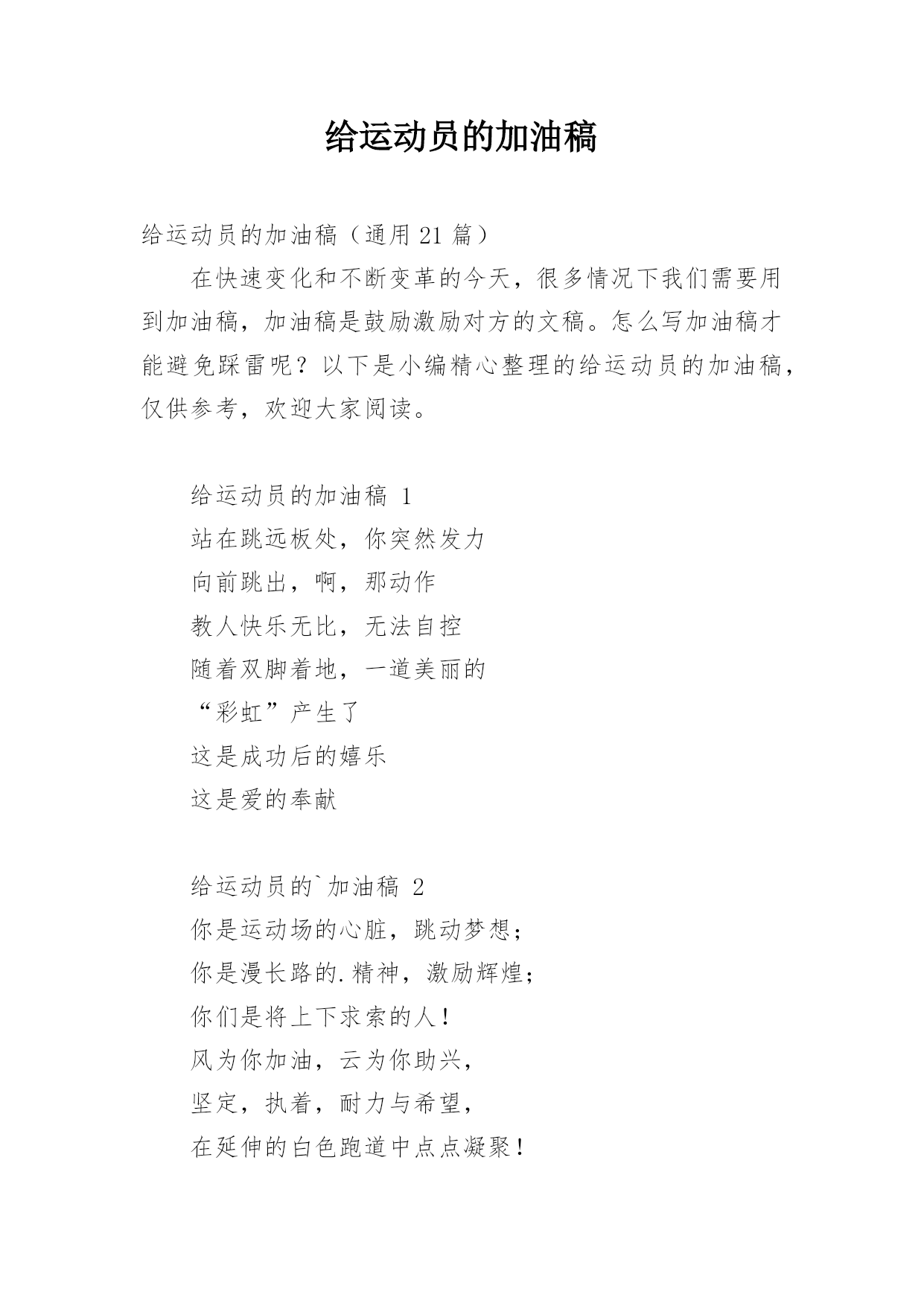 给运动员的加油稿给运动员的加油稿(通用21篇)在快速变化和不断变革的今天,很多情况下我们需要用到加油稿,加油稿是鼓励激励对方的文稿。怎么写加油稿才能避免踩雷呢?以下是小编精心整理的给运动员的加油稿,仅供参考,欢迎大家阅读。给运动员的加油稿1站在跳远板处,你突然发力向前跳出,啊,那动作教人快乐无比,无法自控随着双脚着地,一道美丽的“彩虹”产生了这是成功后的嬉乐这是爱的奉献给运动员的`加油稿2你是运动场的心脏,跳动梦想;你是漫长路的.精神,激励辉煌;你们是将上下求索的人!风为你加油,云为你助兴,坚定,执着,耐