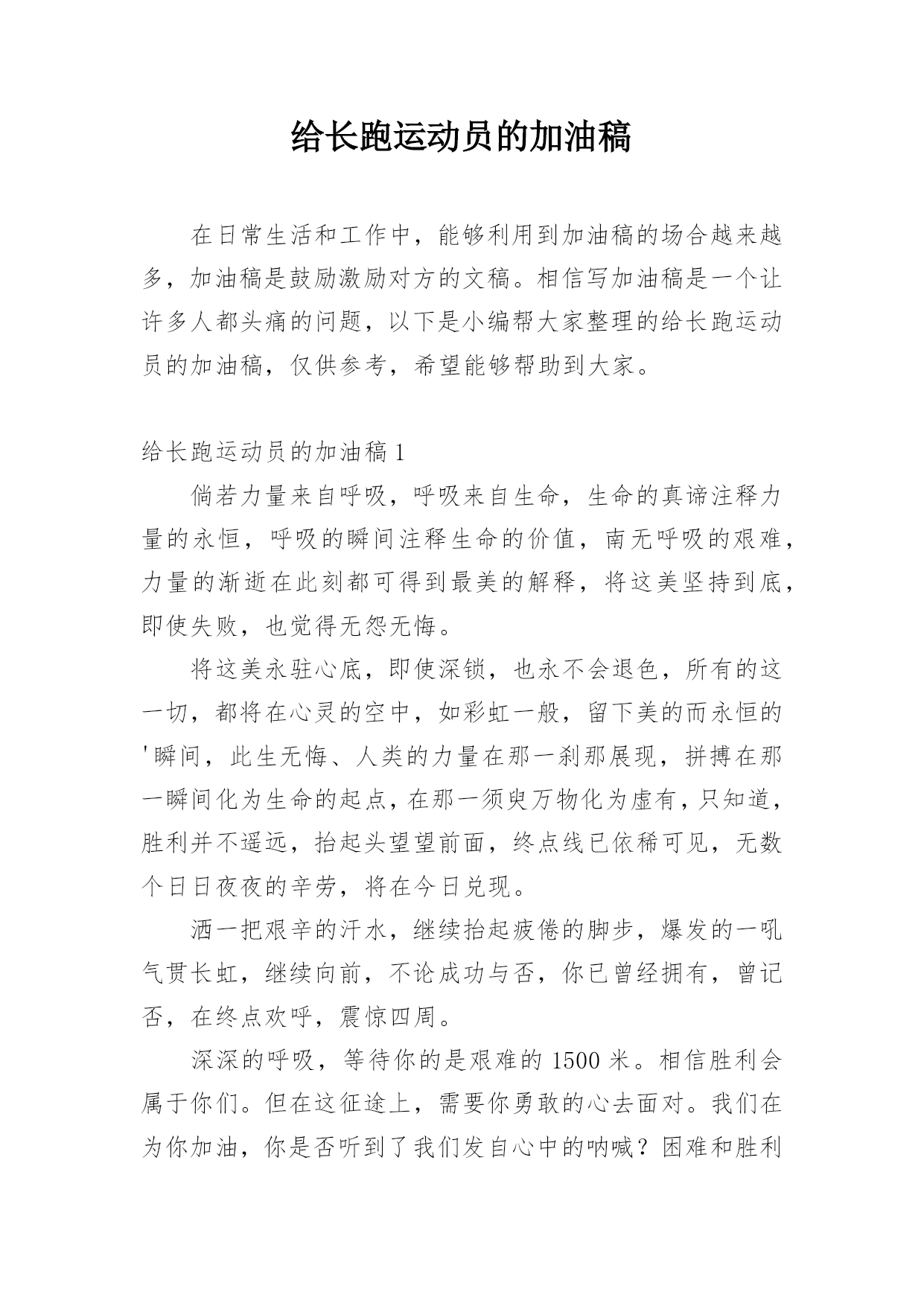 给长跑运动员的加油稿在日常生活和工作中,能够利用到加油稿的场合越来越多,加油稿是鼓励激励对方的文稿。相信写加油稿是一个让许多人都头痛的问题,以下是小编帮大家整理的给长跑运动员的加油稿,仅供参考,希望能够帮助到大家。给长跑运动员的加油稿1倘若力量来自呼吸,呼吸来自生命,生命的真谛注释力量的永恒,呼吸的瞬间注释生命的价值,南无呼吸的艰难,力量的渐逝在此刻都可得到最美的解释,将这美坚持到底,即使失败,也觉得无怨无悔。将这美永驻心底,即使深锁,也永不会退色,所有的这一切,都将在心灵的空中,如彩虹一般,留下美的而永