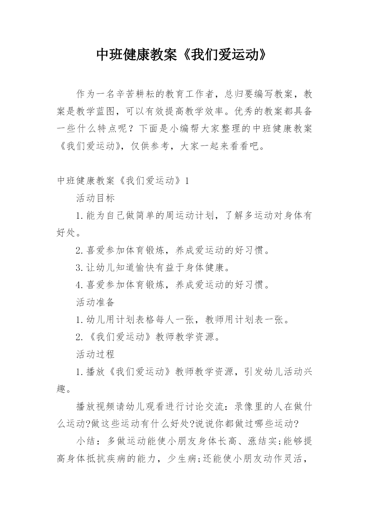 中班健康教案《我们爱运动》作为一名辛苦耕耘的教育工作者,总归要编写教案,教案是教学蓝图,可以有效提高教学效率。优秀的教案都具备一些什么特点呢?下面是小编帮大家整理的中班健康教案《我们爱运动》,仅供参考,大家一起来看看吧。中班健康教案《我们爱运动》1活动目标1.能为自己做简单的周运动计划,了解多运动对身体有好处。2.喜爱参加体育锻炼,养成爱运动的好习惯。3.让幼儿知道愉快有益于身体健康。4.喜爱参加体育锻炼,养成爱运动的好习惯。活动准备1.幼儿用计划表格每人一张,教师用计划表一张。2.《我们爱运动》教师教学