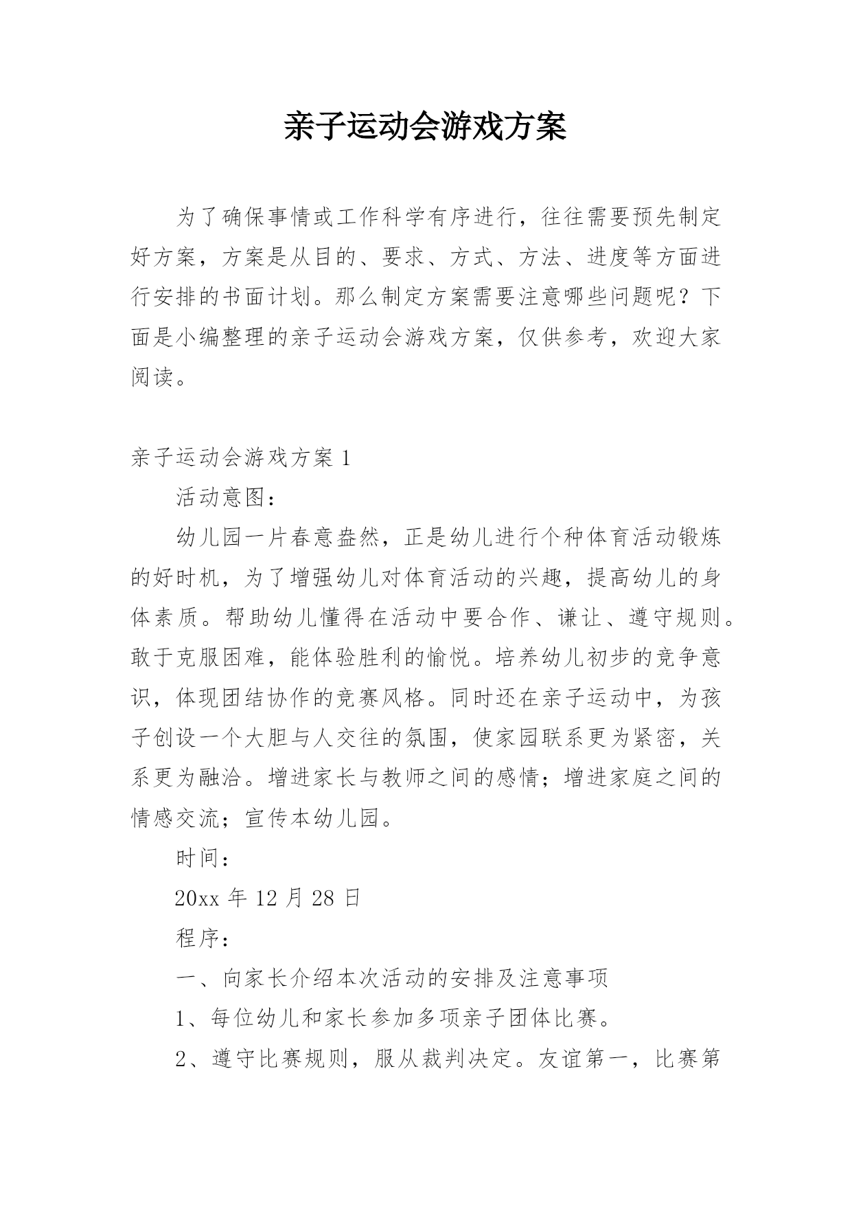 亲子运动会游戏方案为了确保事情或工作科学有序进行,往往需要预先制定好方案,方案是从目的、要求、方式、方法、进度等方面进行安排的书面计划。那么制定方案需要注意哪些问题呢?下面是小编整理的亲子运动会游戏方案,仅供参考,欢迎大家阅读。亲子运动会游戏方案1活动意图:幼儿园一片春意盎然,正是幼儿进行个种体育活动锻炼的好时机,为了增强幼儿对体育活动的兴趣,提高幼儿的身体素质。帮助幼儿懂得在活动中要合作、谦让、遵守规则。敢于克服困难,能体验胜利的愉悦。培养幼儿初步的竞争意识,体现团结协作的竞赛风格。同时还在亲子运动中,