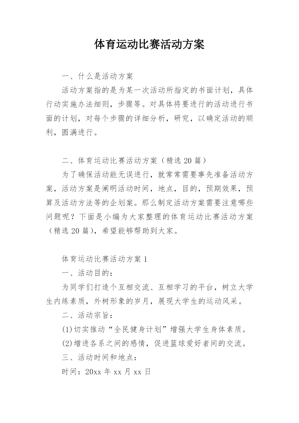 体育运动比赛活动方案一、什么是活动方案活动方案指的是为某一次活动所指定的书面计划,具体行动实施办法细则,步骤等。对具体将要进行的活动进行书面的计划,对每个步骤的详细分析,研究,以确定活动的顺利,圆满进行。二、体育运动比赛活动方案(精选20篇)为了确保活动能无误进行,就常常需要事先准备活动方案,活动方案是阐明活动时间,地点,目的,预期效果,预算及活动方法等的企划案。那么制定活动方案需要注意哪些问题呢?下面是小编为大家整理的体育运动比赛活动方案(精选20篇),希望能够帮助到大家。体育运动比赛活动方案1一、活动