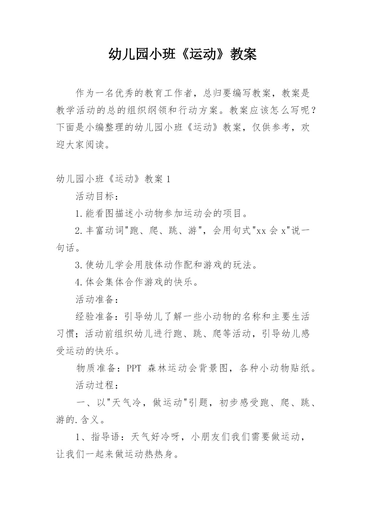 幼儿园小班《运动》教案作为一名优秀的教育工作者,总归要编写教案,教案是教学活动的总的组织纲领和行动方案。教案应该怎么写呢?下面是小编整理的幼儿园小班《运动》教案,仅供参考,欢迎大家阅读。幼儿园小班《运动》教案1活动目标:1.能看图描述小动物参加运动会的项目。2.丰富动词"跑、爬、跳、游",会用句式"xx会x"说一句话。3.使幼儿学会用肢体动作配和游戏的玩法。4.体会集体合作游戏的快乐。活动准备:经验准备:引导幼儿了解一些小动物的名称和主要生活习惯;活动前组织幼儿进行跑、跳、爬等活动,引导幼儿感受运动的快乐