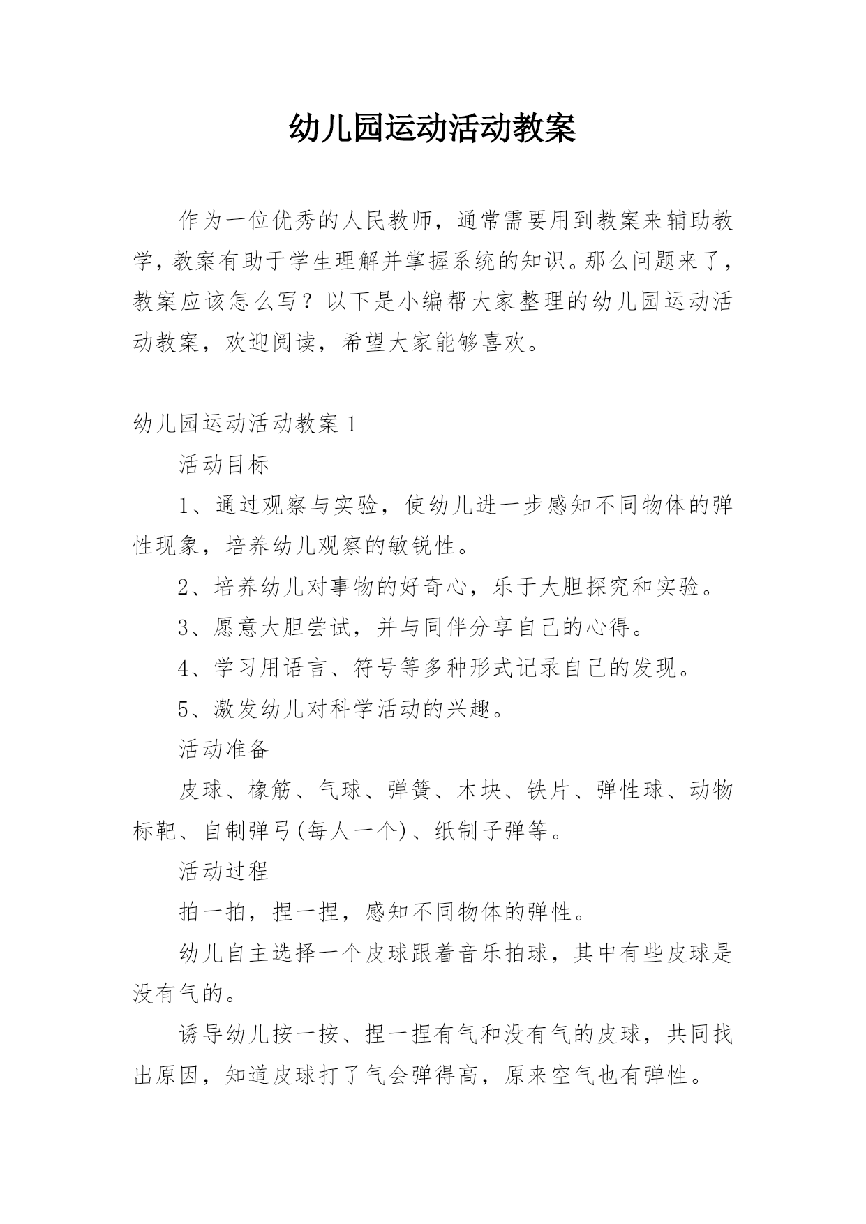 幼儿园运动活动教案作为一位优秀的人民教师,通常需要用到教案来辅助教学,教案有助于学生理解并掌握系统的知识。那么问题来了,教案应该怎么写?以下是小编帮大家整理的幼儿园运动活动教案,欢迎阅读,希望大家能够喜欢。幼儿园运动活动教案1活动目标1、通过观察与实验,使幼儿进一步感知不同物体的弹性现象,培养幼儿观察的敏锐性。2、培养幼儿对事物的好奇心,乐于大胆探究和实验。3、愿意大胆尝试,并与同伴分享自己的心得。4、学习用语言、符号等多种形式记录自己的发现。5、激发幼儿对科学活动的兴趣。活动准备皮球、橡筋、气球、弹簧、