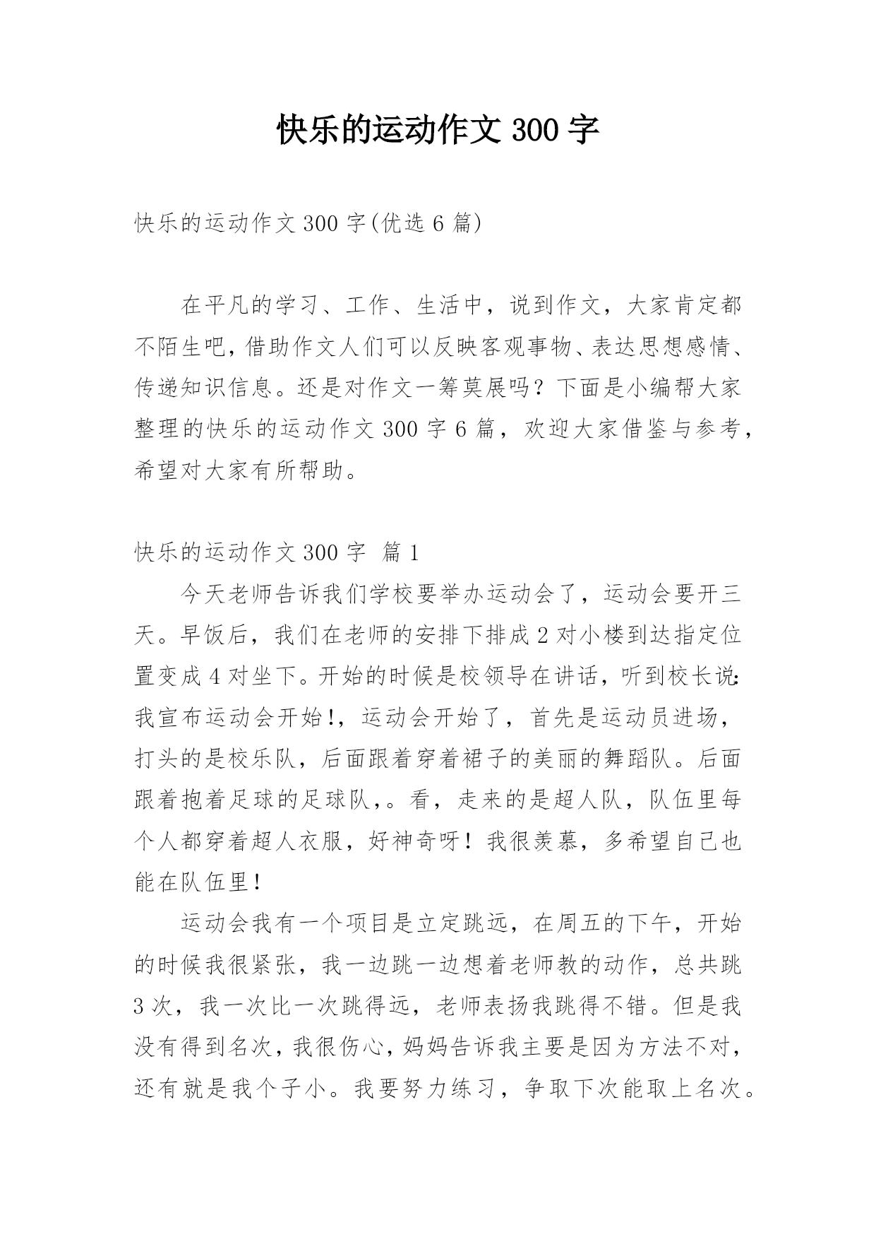 快乐的运动作文300字快乐的运动作文300字(优选6篇)在平凡的学习、工作、生活中,说到作文,大家肯定都不陌生吧,借助作文人们可以反映客观事物、表达思想感情、传递知识信息。还是对作文一筹莫展吗?下面是小编帮大家整理的快乐的运动作文300字6篇,欢迎大家借鉴与参考,希望对大家有所帮助。快乐的运动作文300字篇1今天老师告诉我们学校要举办运动会了,运动会要开三天。早饭后,我们在老师的安排下排成2对小楼到达指定位置变成4对坐下。开始的时候是校领导在讲话,听到校长说:我宣布运动会开始!,运动会开始了,首先是运动员
