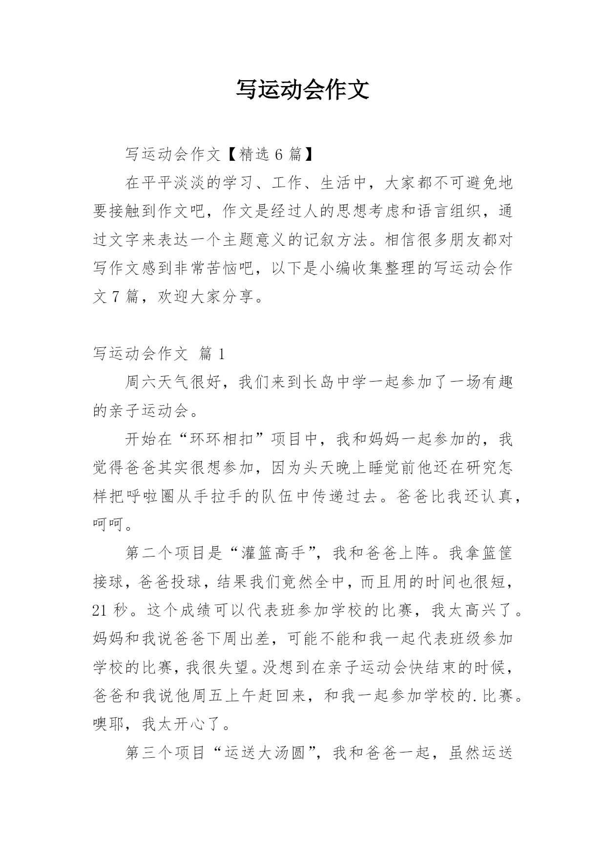 写运动会作文写运动会作文【精选6篇】在平平淡淡的学习、工作、生活中,大家都不可避免地要接触到作文吧,作文是经过人的思想考虑和语言组织,通过文字来表达一个主题意义的记叙方法。相信很多朋友都对写作文感到非常苦恼吧,以下是小编收集整理的写运动会作文7篇,欢迎大家分享。写运动会作文篇1周六天气很好,我们来到长岛中学一起参加了一场有趣的亲子运动会。开始在“环环相扣”项目中,我和妈妈一起参加的,我觉得爸爸其实很想参加,因为头天晚上睡觉前他还在研究怎样把呼啦圈从手拉手的队伍中传递过去。爸爸比我还认真,呵呵。第二个项目是