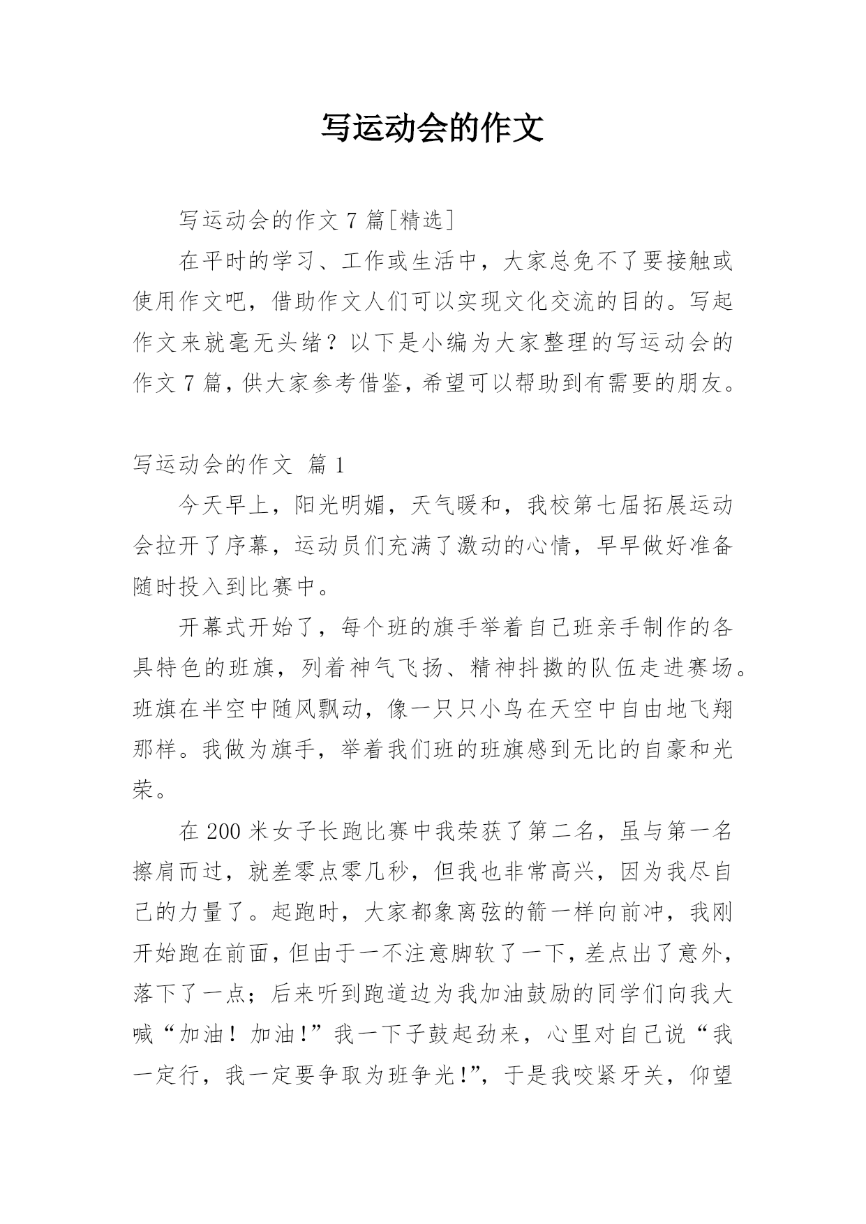 写运动会的作文写运动会的作文7篇[精选]在平时的学习、工作或生活中,大家总免不了要接触或使用作文吧,借助作文人们可以实现文化交流的目的。写起作文来就毫无头绪?以下是小编为大家整理的写运动会的作文7篇,供大家参考借鉴,希望可以帮助到有需要的朋友。写运动会的作文篇1今天早上,阳光明媚,天气暖和,我校第七届拓展运动会拉开了序幕,运动员们充满了激动的心情,早早做好准备随时投入到比赛中。开幕式开始了,每个班的旗手举着自己班亲手制作的各具特色的班旗,列着神气飞扬、精神抖擞的队伍走进赛场。班旗在半空中随风飘动,像一只只
