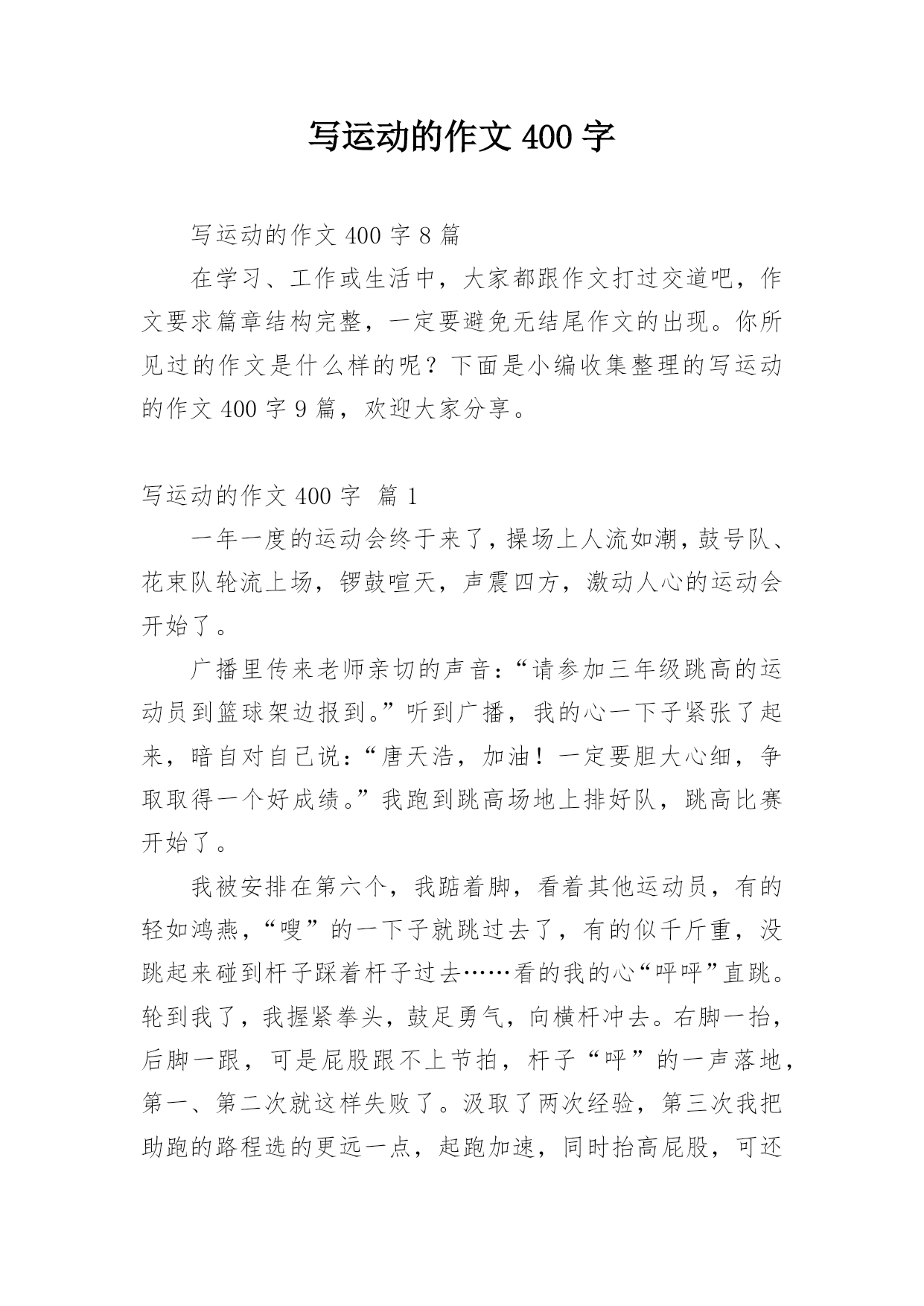 写运动的作文400字写运动的作文400字8篇在学习、工作或生活中,大家都跟作文打过交道吧,作文要求篇章结构完整,一定要避免无结尾作文的出现。你所见过的作文是什么样的呢?下面是小编收集整理的写运动的作文400字9篇,欢迎大家分享。写运动的作文400字篇1一年一度的运动会终于来了,操场上人流如潮,鼓号队、花束队轮流上场,锣鼓喧天,声震四方,激动人心的运动会开始了。广播里传来老师亲切的声音:“请参加三年级跳高的运动员到篮球架边报到。”听到广播,我的心一下子紧张了起来,暗自对自己说:“唐天浩,加油!一定要胆大心细