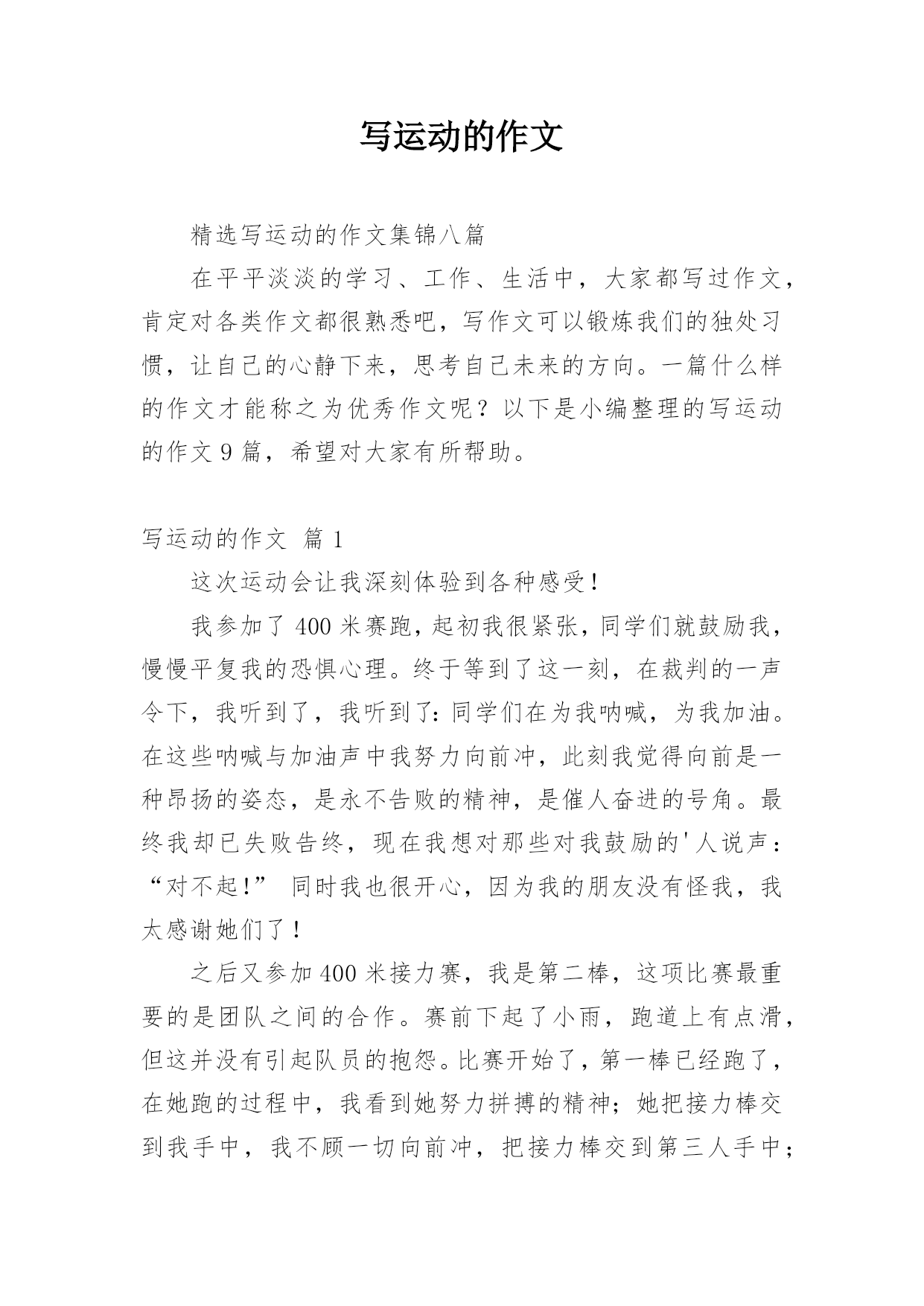 写运动的作文精选写运动的作文集锦八篇在平平淡淡的学习、工作、生活中,大家都写过作文,肯定对各类作文都很熟悉吧,写作文可以锻炼我们的独处习惯,让自己的心静下来,思考自己未来的方向。一篇什么样的作文才能称之为优秀作文呢?以下是小编整理的写运动的作文9篇,希望对大家有所帮助。写运动的作文篇1这次运动会让我深刻体验到各种感受!我参加了400米赛跑,起初我很紧张,同学们就鼓励我,慢慢平复我的恐惧心理。终于等到了这一刻,在裁判的一声令下,我听到了,我听到了:同学们在为我呐喊,为我加油。在这些呐喊与加油声中我努力向前冲