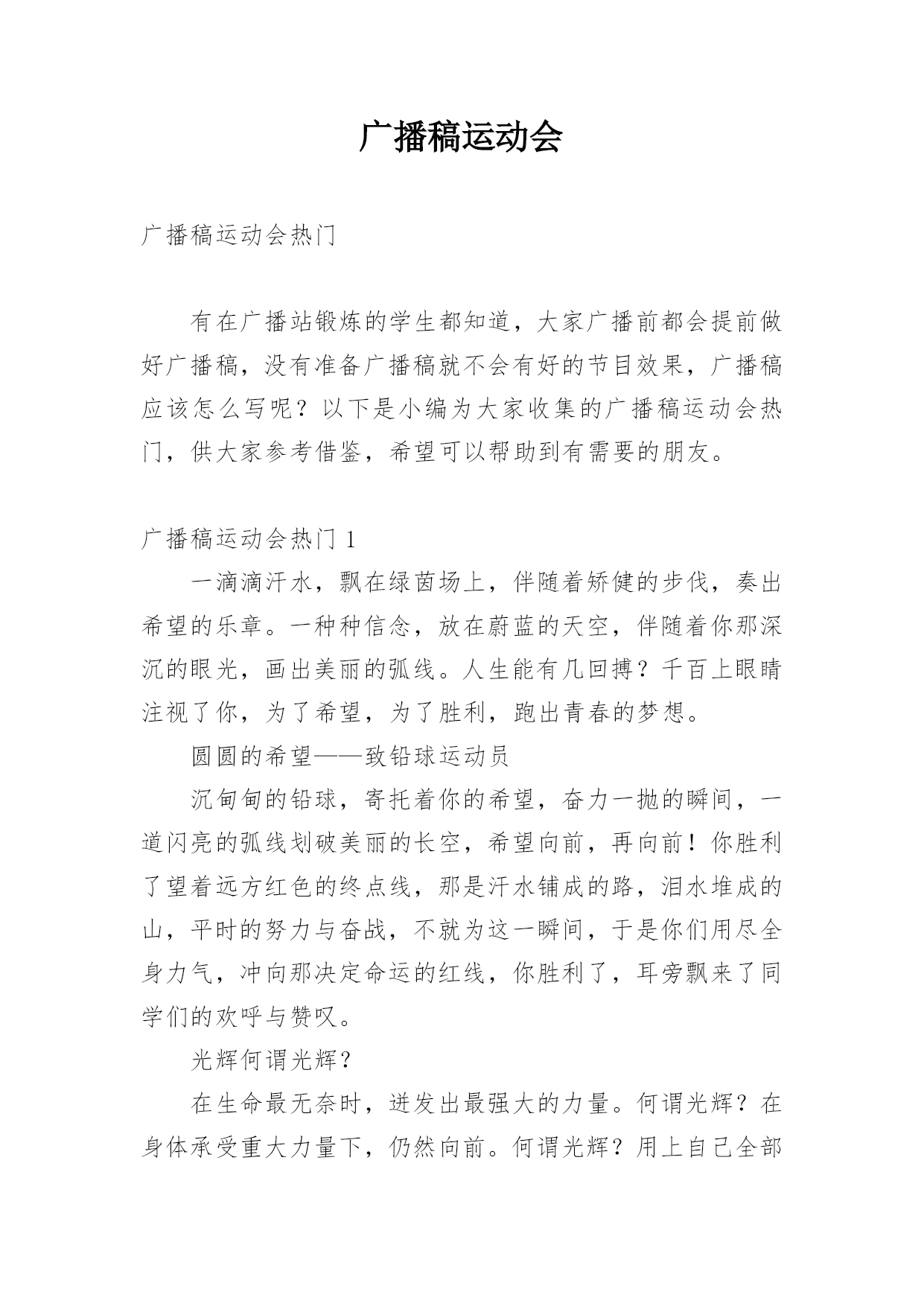广播稿运动会广播稿运动会热门有在广播站锻炼的学生都知道,大家广播前都会提前做好广播稿,没有准备广播稿就不会有好的节目效果,广播稿应该怎么写呢?以下是小编为大家收集的广播稿运动会热门,供大家参考借鉴,希望可以帮助到有需要的朋友。广播稿运动会热门1一滴滴汗水,飘在绿茵场上,伴随着矫健的步伐,奏出希望的乐章。一种种信念,放在蔚蓝的天空,伴随着你那深沉的眼光,画出美丽的弧线。人生能有几回搏?千百上眼睛注视了你,为了希望,为了胜利,跑出青春的梦想。圆圆的希望——致铅球运动员沉甸甸的铅球,寄托着你的希望,奋力一抛的瞬
