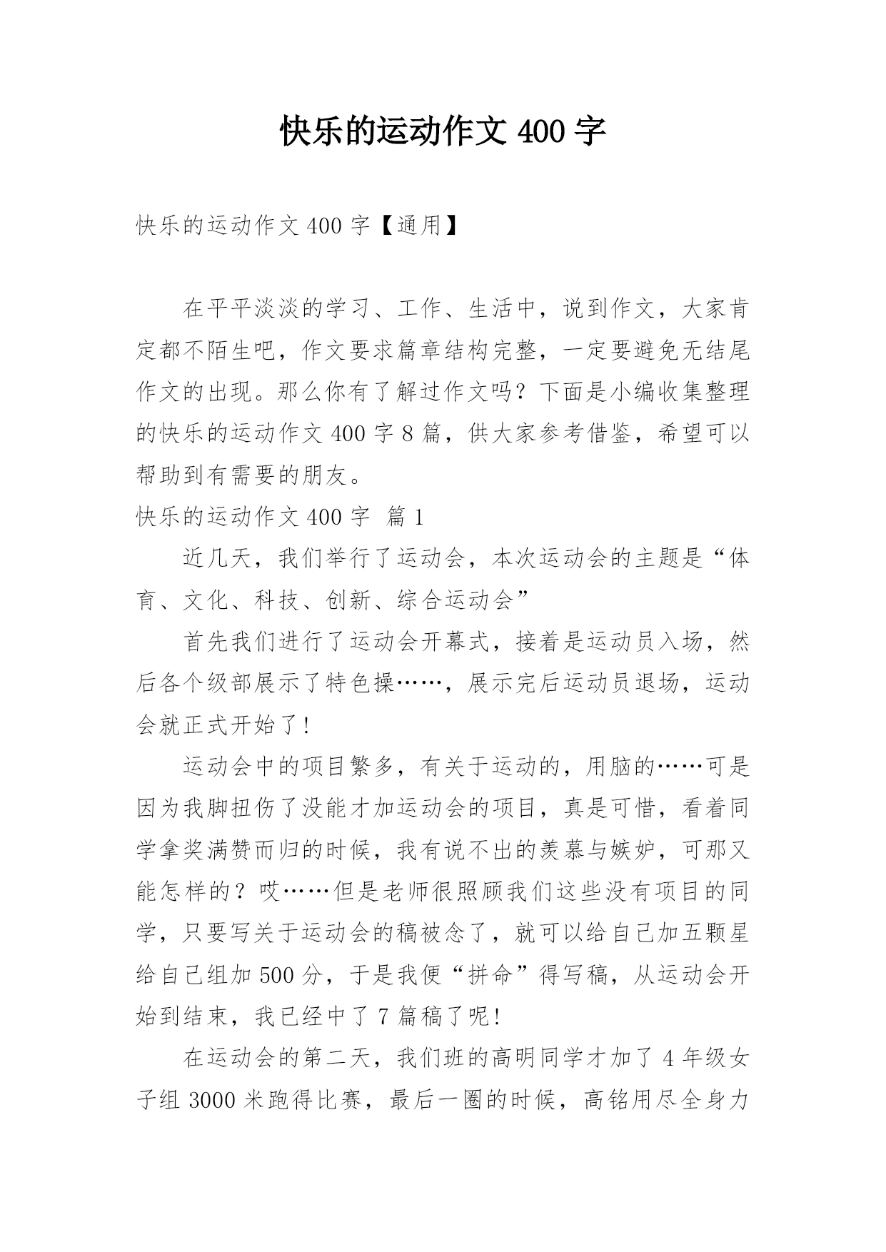 快乐的运动作文400字快乐的运动作文400字【通用】在平平淡淡的学习、工作、生活中,说到作文,大家肯定都不陌生吧,作文要求篇章结构完整,一定要避免无结尾作文的出现。那么你有了解过作文吗?下面是小编收集整理的快乐的运动作文400字8篇,供大家参考借鉴,希望可以帮助到有需要的朋友。快乐的运动作文400字篇1近几天,我们举行了运动会,本次运动会的主题是“体育、文化、科技、创新、综合运动会”首先我们进行了运动会开幕式,接着是运动员入场,然后各个级部展示了特色操……,展示完后运动员退场,运动会就正式开始了!运动会中