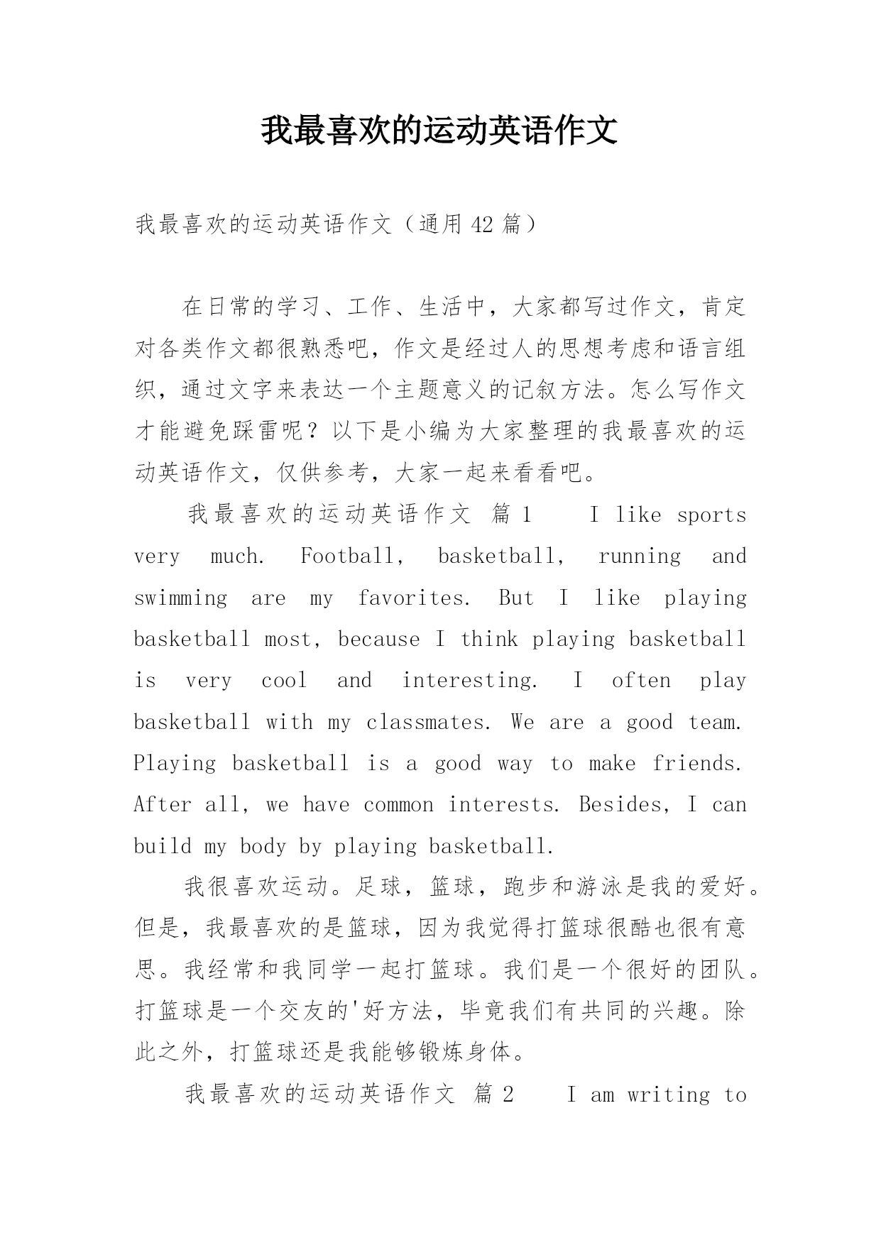 我最喜欢的运动英语作文我最喜欢的运动英语作文(通用42篇)在日常的学习、工作、生活中,大家都写过作文,肯定对各类作文都很熟悉吧,作文是经过人的思想考虑和语言组织,通过文字来表达一个主题意义的记叙方法。怎么写作文才能避免踩雷呢?以下是小编为大家整理的我最喜欢的运动英语作文,仅供参考,大家一起来看看吧。我最喜欢的运动英语作文篇1Ilikesportsverymuch.Football,basketball,runningandswimmingaremyfavorites.ButIlikeplayingbask