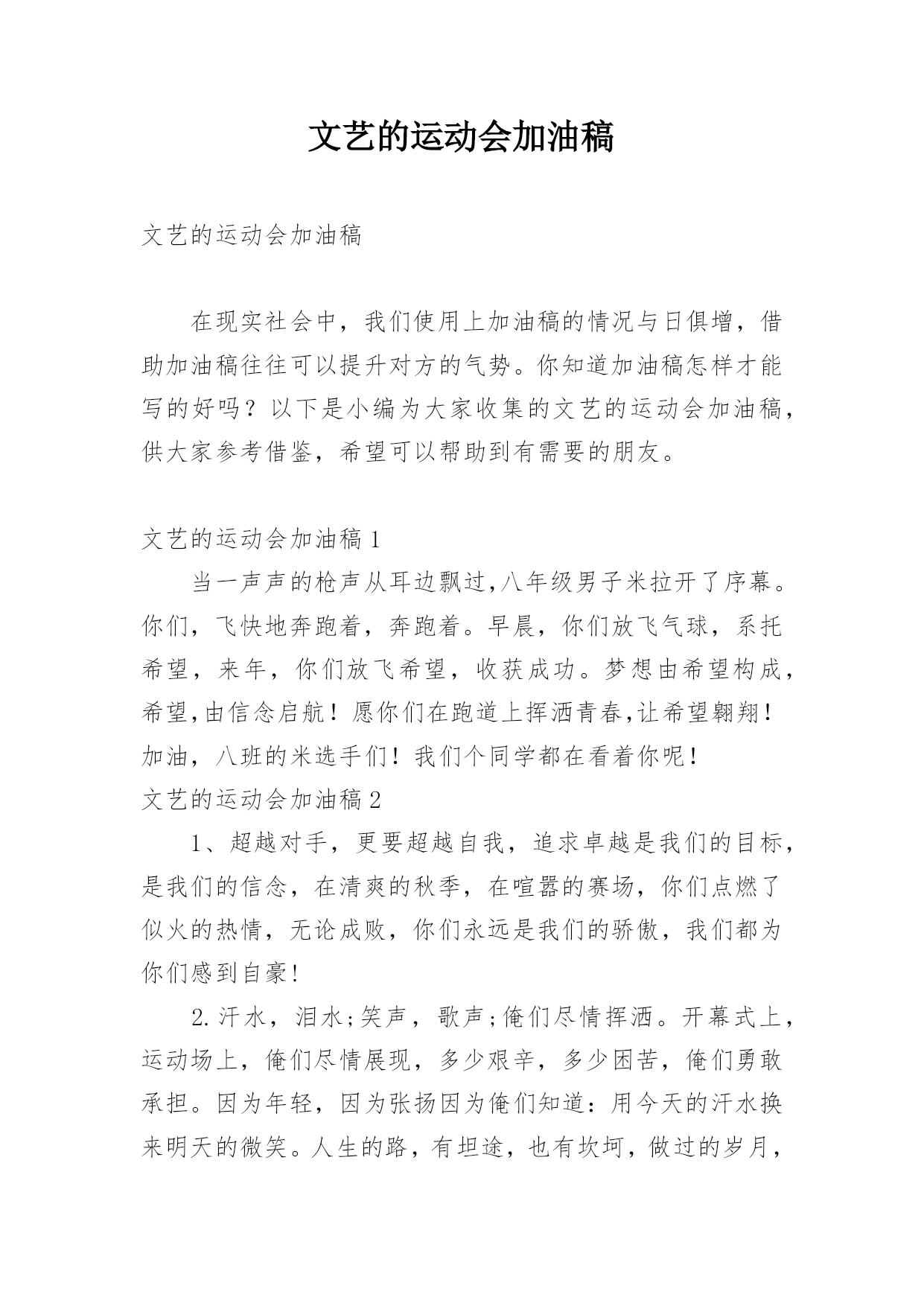 文艺的运动会加油稿文艺的运动会加油稿在现实社会中,我们使用上加油稿的情况与日俱增,借助加油稿往往可以提升对方的气势。你知道加油稿怎样才能写的好吗?以下是小编为大家收集的文艺的运动会加油稿,供大家参考借鉴,希望可以帮助到有需要的朋友。文艺的运动会加油稿1当一声声的枪声从耳边飘过,八年级男子米拉开了序幕。你们,飞快地奔跑着,奔跑着。早晨,你们放飞气球,系托希望,来年,你们放飞希望,收获成功。梦想由希望构成,希望,由信念启航!愿你们在跑道上挥洒青春,让希望翱翔!加油,八班的米选手们!我们个同学都在看着你呢!文艺