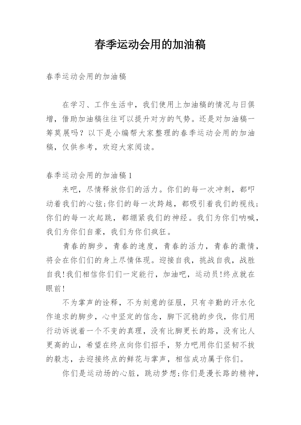 春季运动会用的加油稿春季运动会用的加油稿在学习、工作生活中,我们使用上加油稿的情况与日俱增,借助加油稿往往可以提升对方的气势。还是对加油稿一筹莫展吗?以下是小编帮大家整理的春季运动会用的加油稿,仅供参考,欢迎大家阅读。春季运动会用的加油稿1来吧,尽情释放你们的活力。你们的每一次冲刺,都叩动着我们的心弦;你们的每一次跨越,都吸引着我们的视线;你们的每一次起跳,都绷紧我们的神经。我们为你们呐喊,我们为你们自豪,我们为你们疯狂。青春的脚步,青春的速度,青春的活力,青春的激情,将会在你们们的身上尽情体现。迎接自我