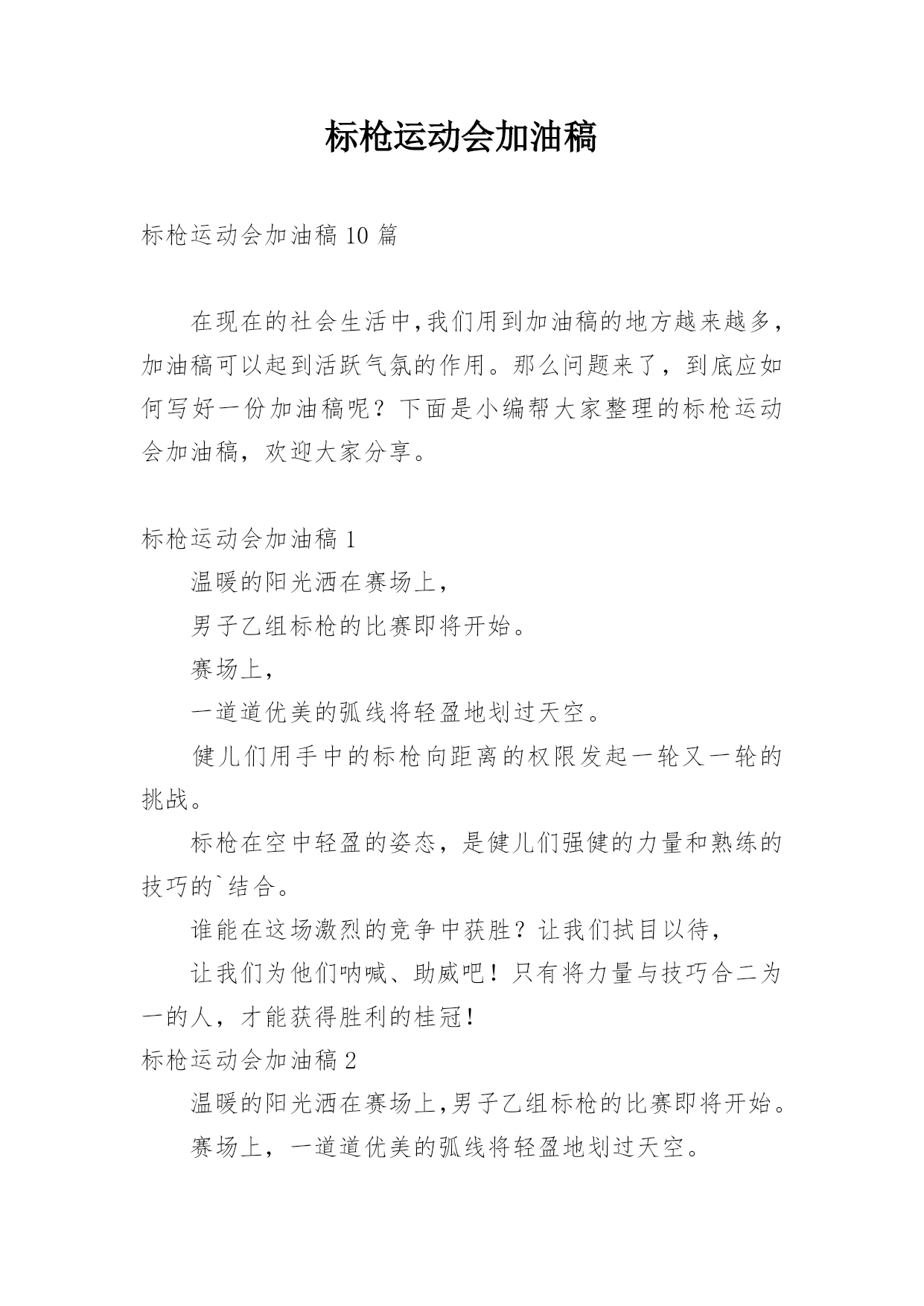 标枪运动会加油稿标枪运动会加油稿10篇在现在的社会生活中,我们用到加油稿的地方越来越多,加油稿可以起到活跃气氛的作用。那么问题来了,到底应如何写好一份加油稿呢?下面是小编帮大家整理的标枪运动会加油稿,欢迎大家分享。标枪运动会加油稿1温暖的阳光洒在赛场上,男子乙组标枪的比赛即将开始。赛场上,一道道优美的弧线将轻盈地划过天空。健儿们用手中的标枪向距离的权限发起一轮又一轮的挑战。标枪在空中轻盈的姿态,是健儿们强健的力量和熟练的技巧的`结合。谁能在这场激烈的竞争中获胜?让我们拭目以待,让我们为他们呐喊、助威吧!只