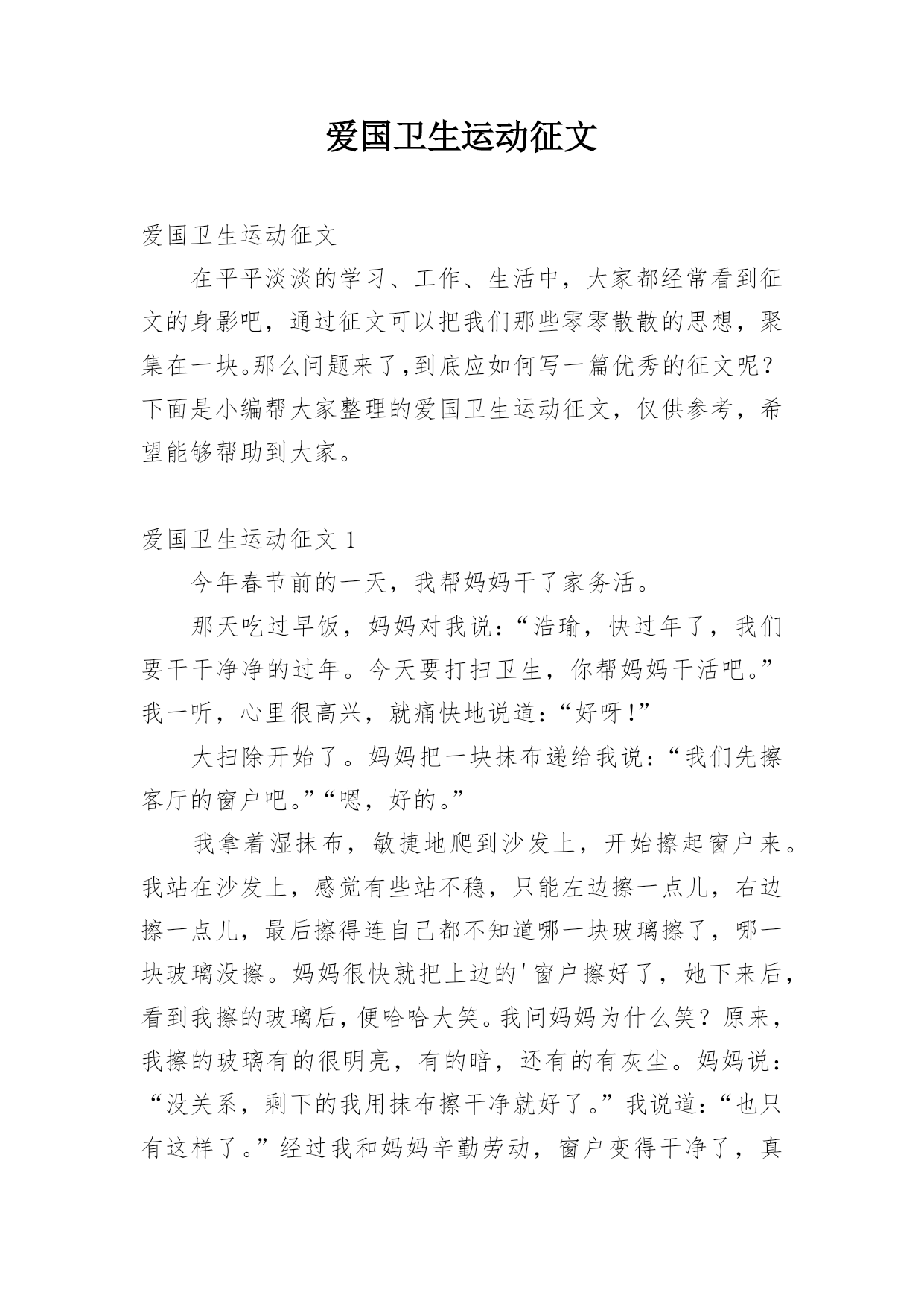 爱国卫生运动征文爱国卫生运动征文在平平淡淡的学习、工作、生活中,大家都经常看到征文的身影吧,通过征文可以把我们那些零零散散的思想,聚集在一块。那么问题来了,到底应如何写一篇优秀的征文呢?下面是小编帮大家整理的爱国卫生运动征文,仅供参考,希望能够帮助到大家。爱国卫生运动征文1今年春节前的一天,我帮妈妈干了家务活。那天吃过早饭,妈妈对我说:“浩瑜,快过年了,我们要干干净净的过年。今天要打扫卫生,你帮妈妈干活吧。”我一听,心里很高兴,就痛快地说道:“好呀!”大扫除开始了。妈妈把一块抹布递给我说:“我们先擦客厅的
