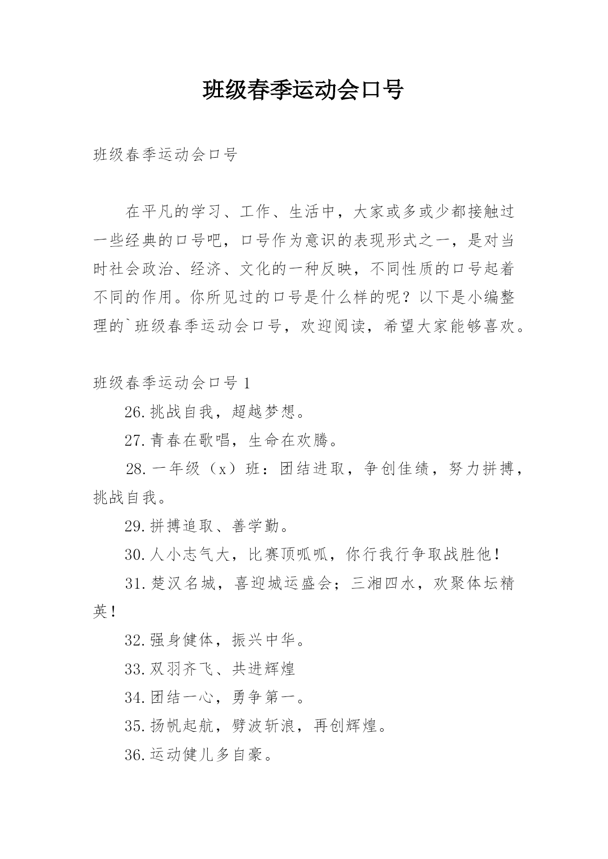 班级春季运动会口号班级春季运动会口号在平凡的学习、工作、生活中,大家或多或少都接触过一些经典的口号吧,口号作为意识的表现形式之一,是对当时社会政治、经济、文化的一种反映,不同性质的口号起着不同的作用。你所见过的口号是什么样的呢?以下是小编整理的`班级春季运动会口号,欢迎阅读,希望大家能够喜欢。班级春季运动会口号126.挑战自我,超越梦想。27.青春在歌唱,生命在欢腾。28.一年级(x)班:团结进取,争创佳绩,努力拼搏,挑战自我。29.拼搏追取、善学勤。30.人小志气大,比赛顶呱呱,你行我行争取战胜他!31