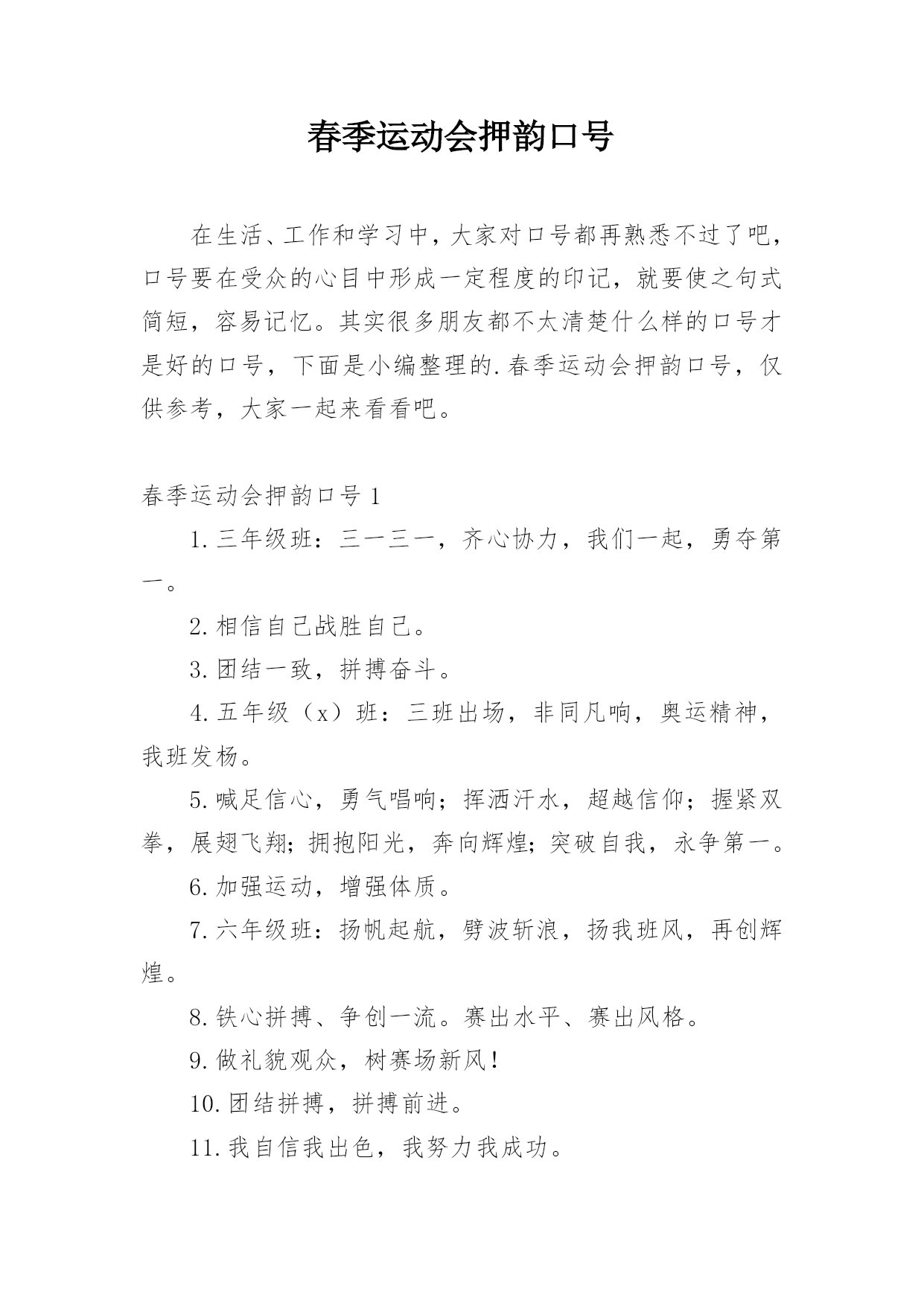 春季运动会押韵口号在生活、工作和学习中,大家对口号都再熟悉不过了吧,口号要在受众的心目中形成一定程度的印记,就要使之句式简短,容易记忆。其实很多朋友都不太清楚什么样的口号才是好的口号,下面是小编整理的.春季运动会押韵口号,仅供参考,大家一起来看看吧。春季运动会押韵口号11.三年级班:三一三一,齐心协力,我们一起,勇夺第一。2.相信自己战胜自己。3.团结一致,拼搏奋斗。4.五年级(x)班:三班出场,非同凡响,奥运精神,我班发杨。5.喊足信心,勇气唱响;挥洒汗水,超越信仰;握紧双拳,展翅飞翔;拥抱阳光,奔向辉