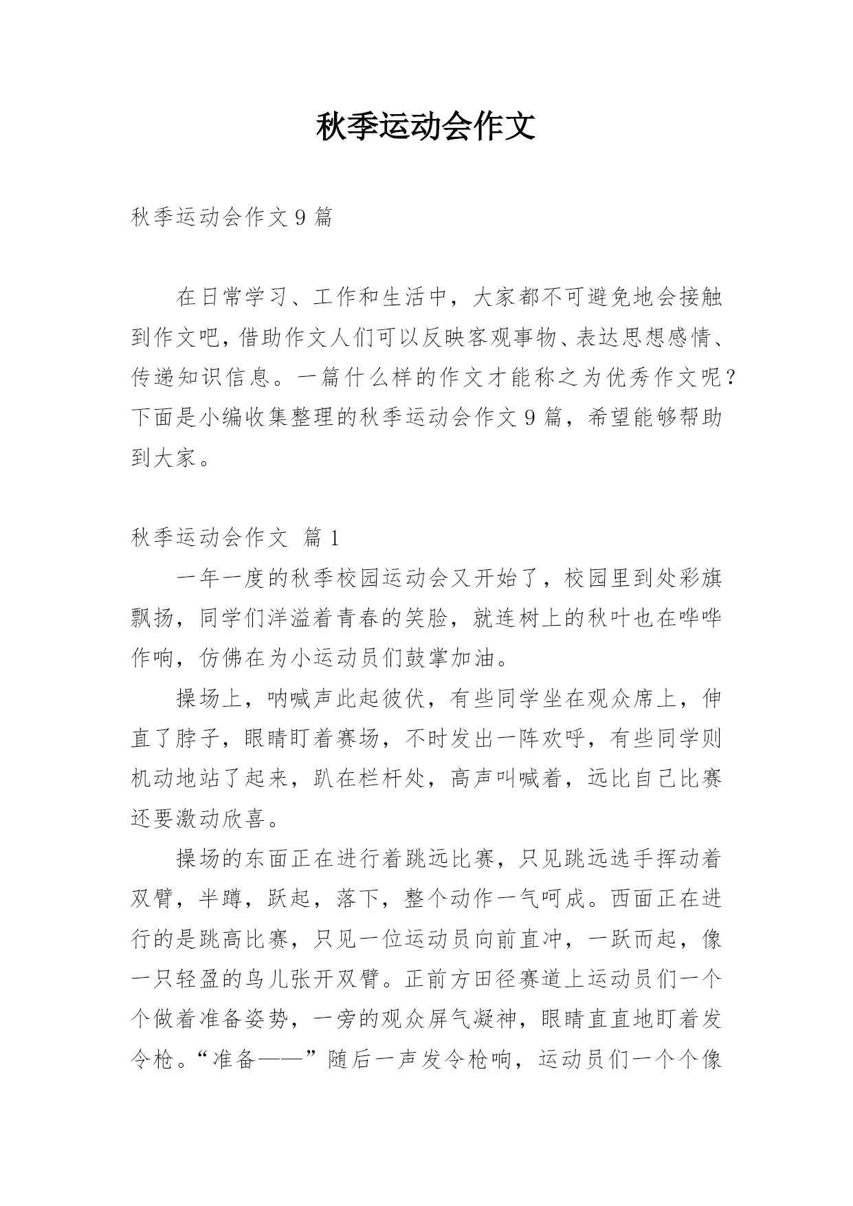 秋季运动会作文秋季运动会作文9篇在日常学习、工作和生活中,大家都不可避免地会接触到作文吧,借助作文人们可以反映客观事物、表达思想感情、传递知识信息。一篇什么样的作文才能称之为优秀作文呢?下面是小编收集整理的秋季运动会作文9篇,希望能够帮助到大家。秋季运动会作文篇1一年一度的秋季校园运动会又开始了,校园里到处彩旗飘扬,同学们洋溢着青春的笑脸,就连树上的秋叶也在哗哗作响,仿佛在为小运动员们鼓掌加油。操场上,呐喊声此起彼伏,有些同学坐在观众席上,伸直了脖子,眼睛盯着赛场,不时发出一阵欢呼,有些同学则机动地站了起
